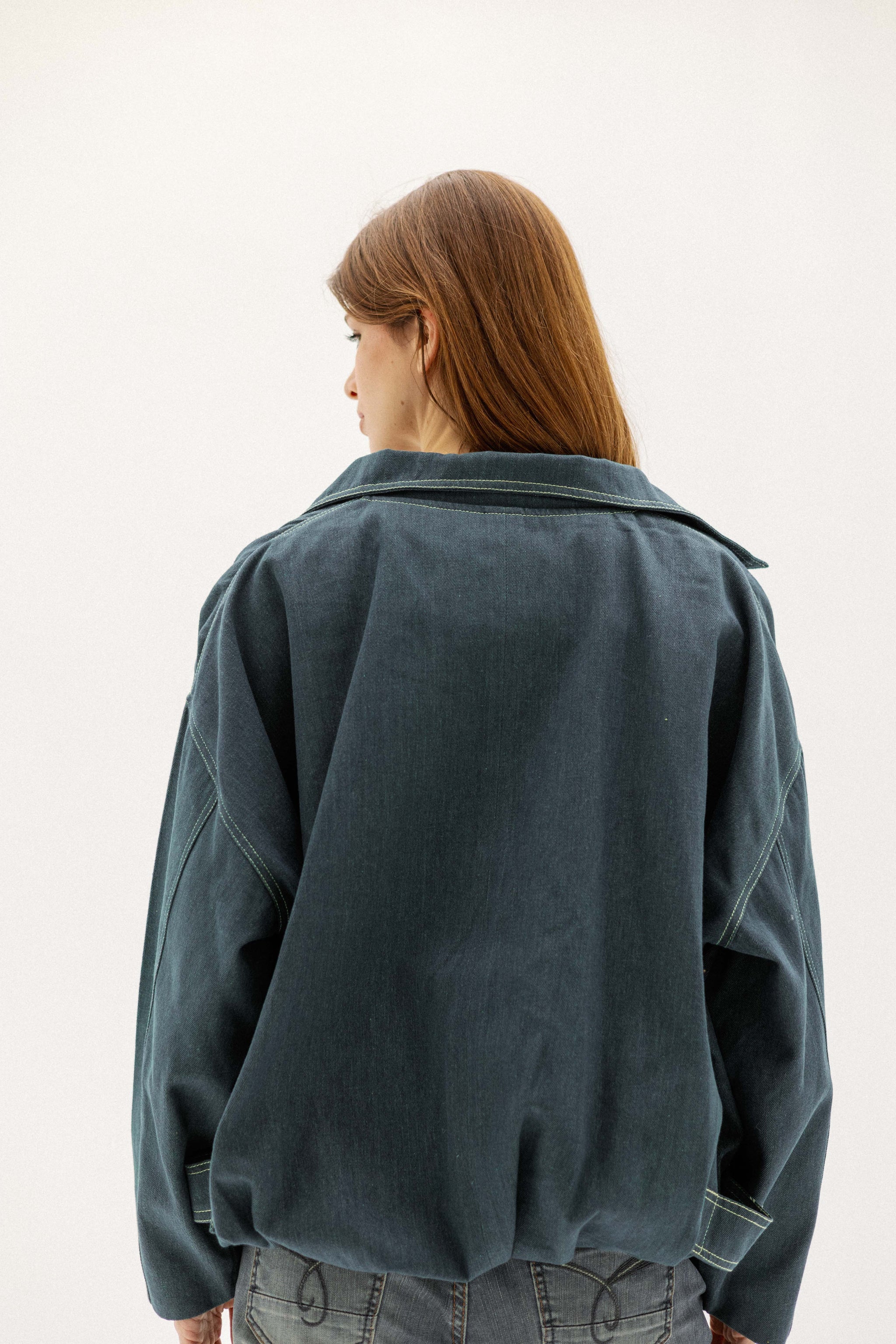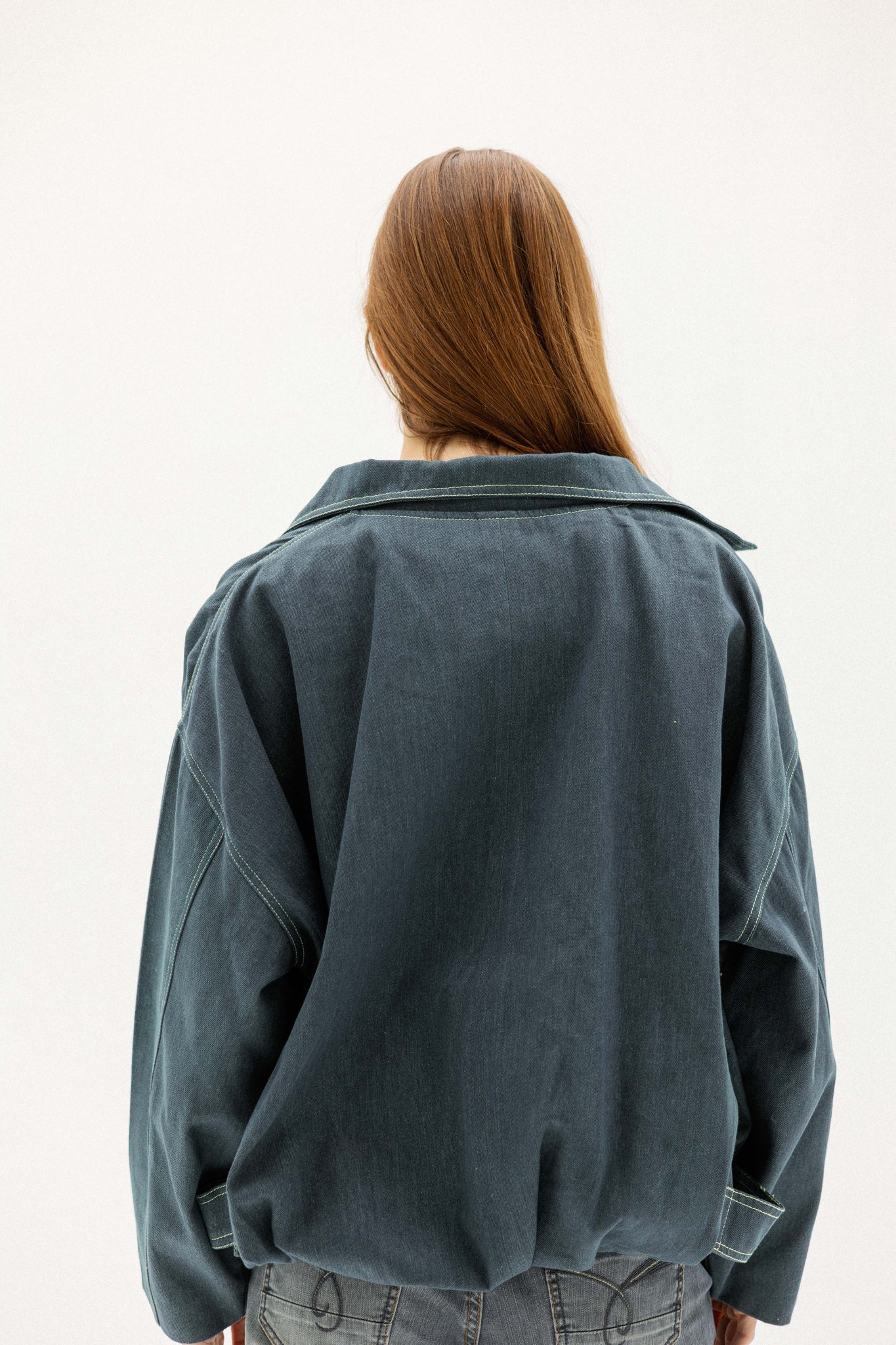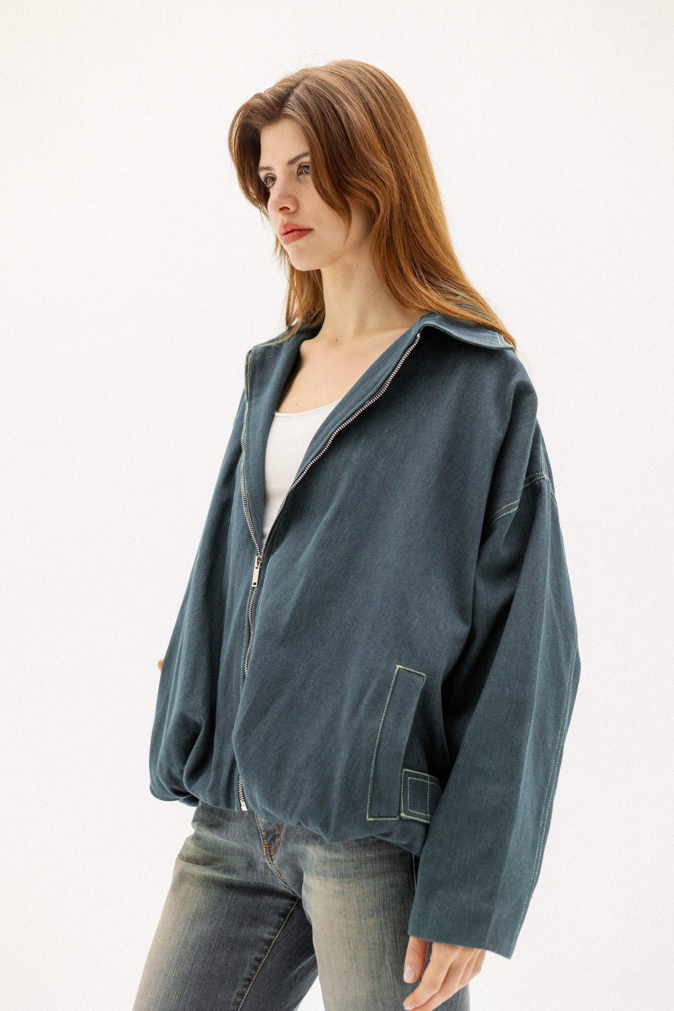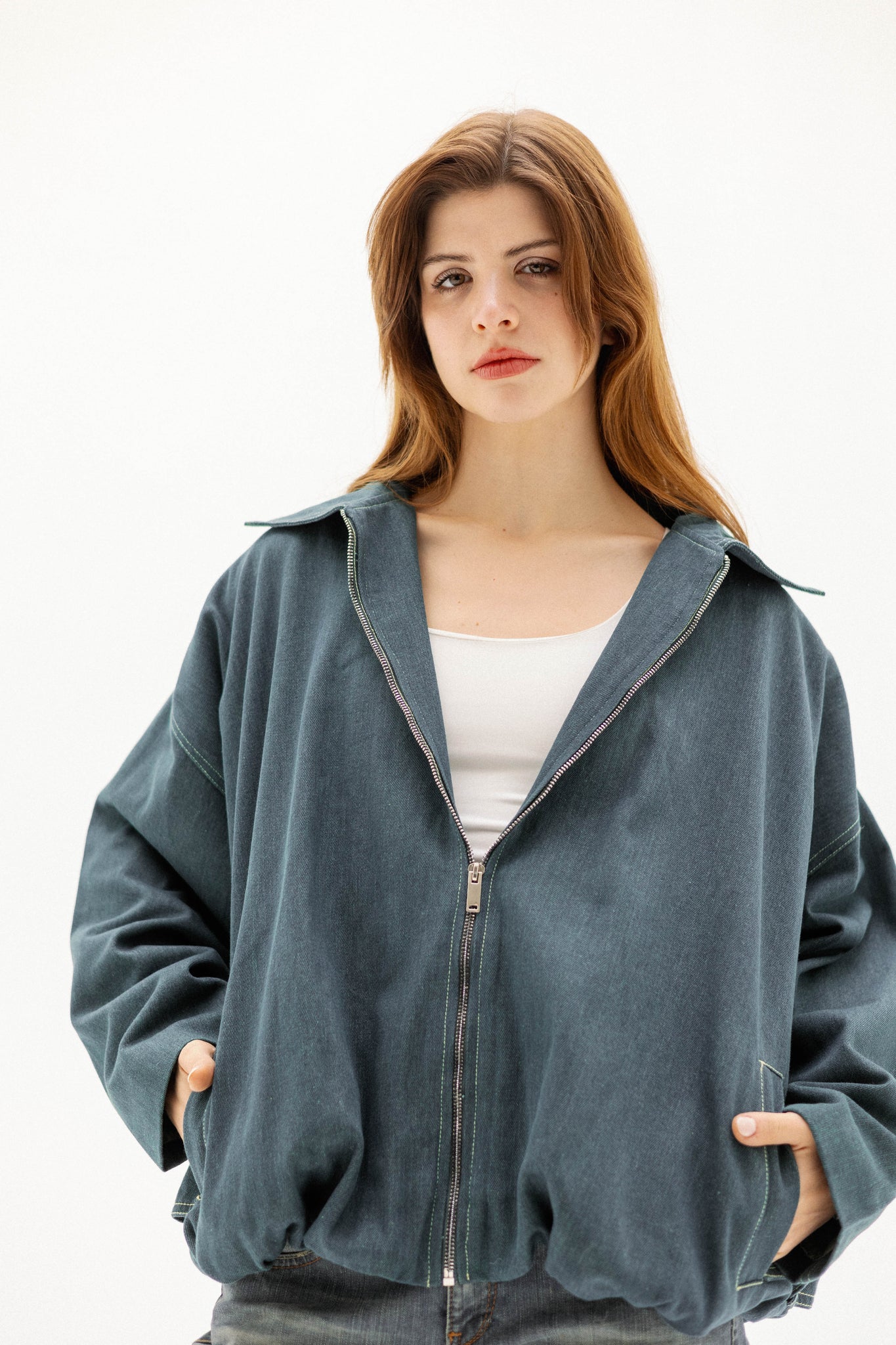 The Overset Bomber is a relaxed-fit outerwear piece inspired by the voluminous silhouette of a balloon jacket. Crafted from a soft, lightweight fabric, it features a loose, draped shape with dropped shoulders and an oversized collar for a laid-back, effortless look. Its muted sage green tone adds a calm, natural vibe, making it a perfect layering piece for both casual streetwear and elevated loungewear