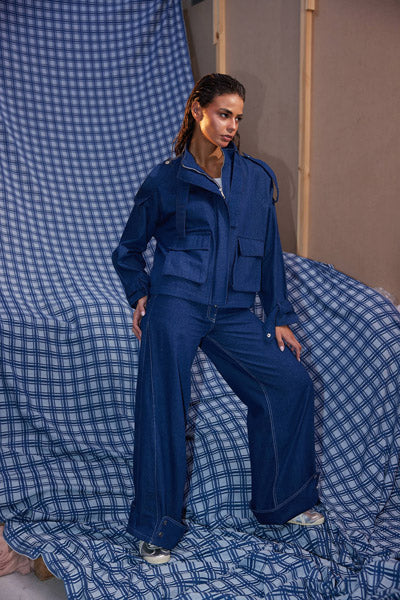 Back-Zip Denim Utility Jacket A fashion-forward denim outfit featuring a loose-fitting dark blue denim jacket with a prominent vertical zipper running down the back. The jacket has wide sleeves, buttoned shoulder tabs, and is paired with matching denim pants. The model is photographed from behind against a blue checkered fabric backdrop, with wet-styled hair adding a modern, edgy look