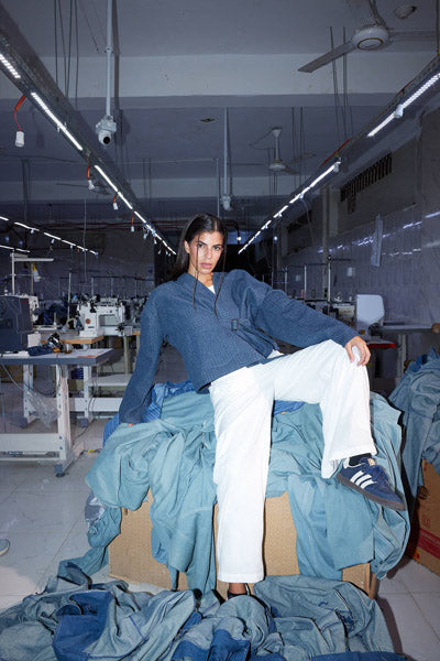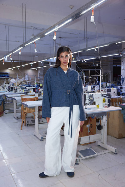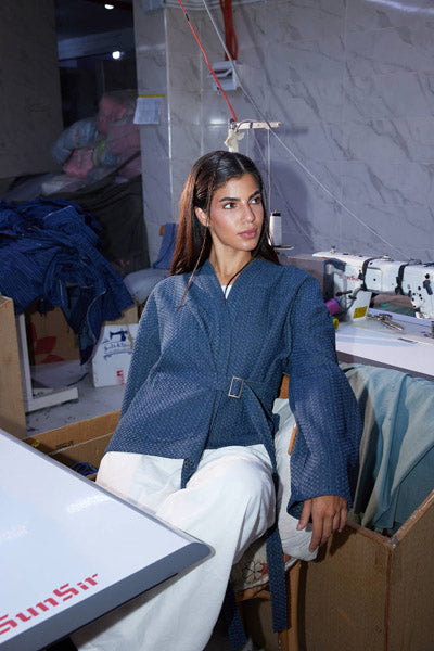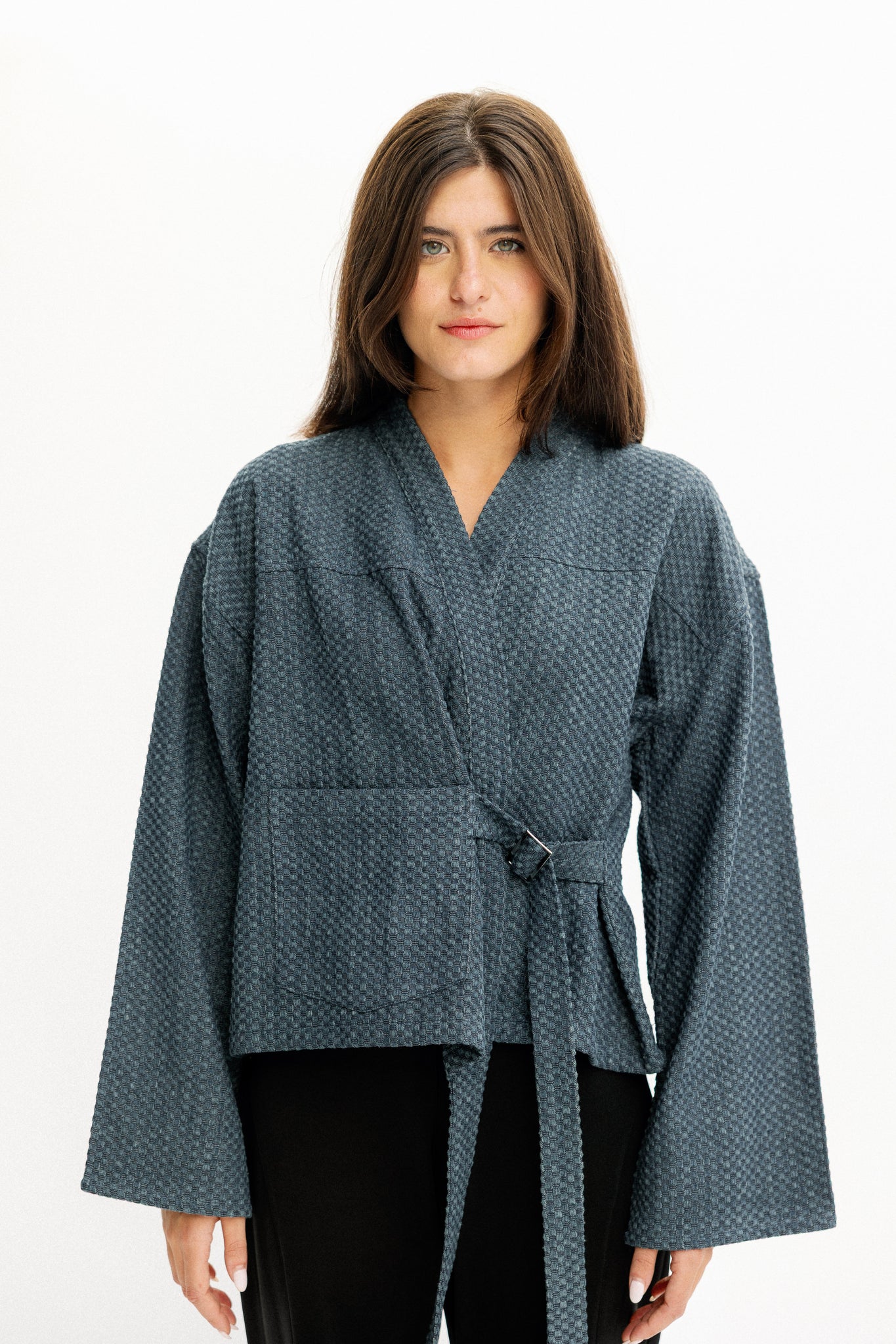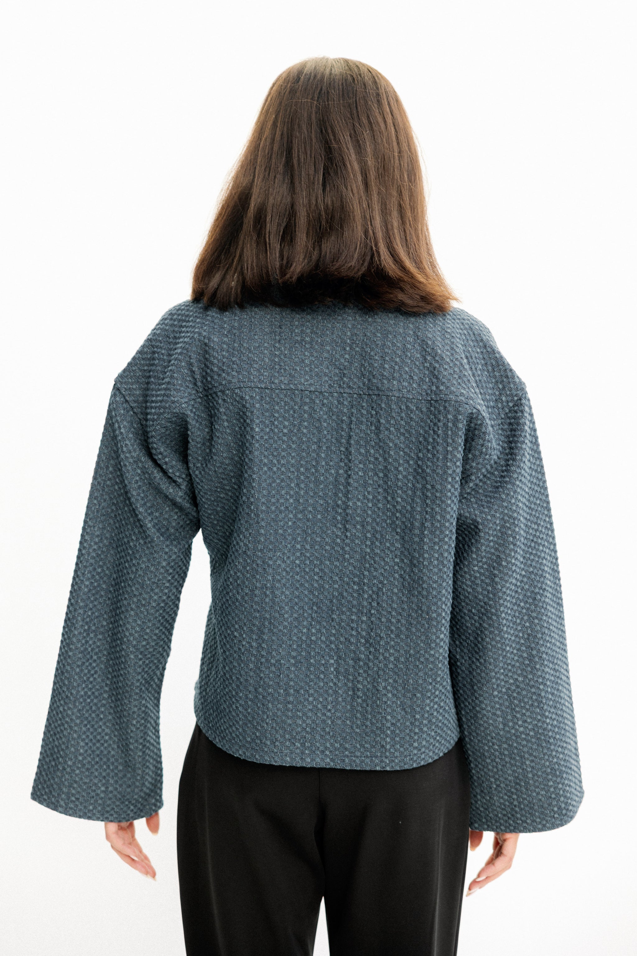 A breezy, lightweight jacket in a muted sky-blue shade, featuring a relaxed open front and clean lines. Its effortless drape adds a touch of softness and serenity to any minimalist outfit.