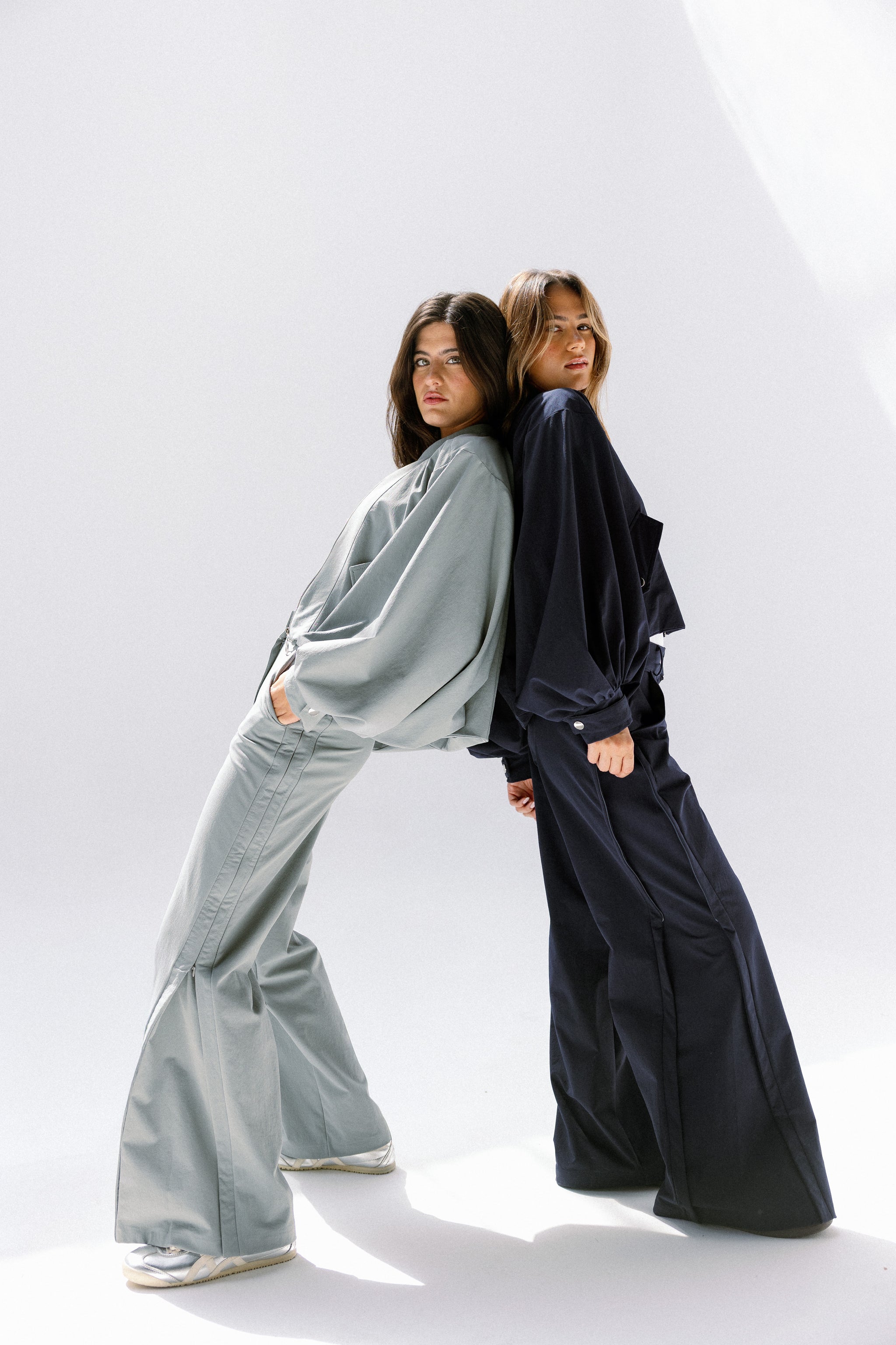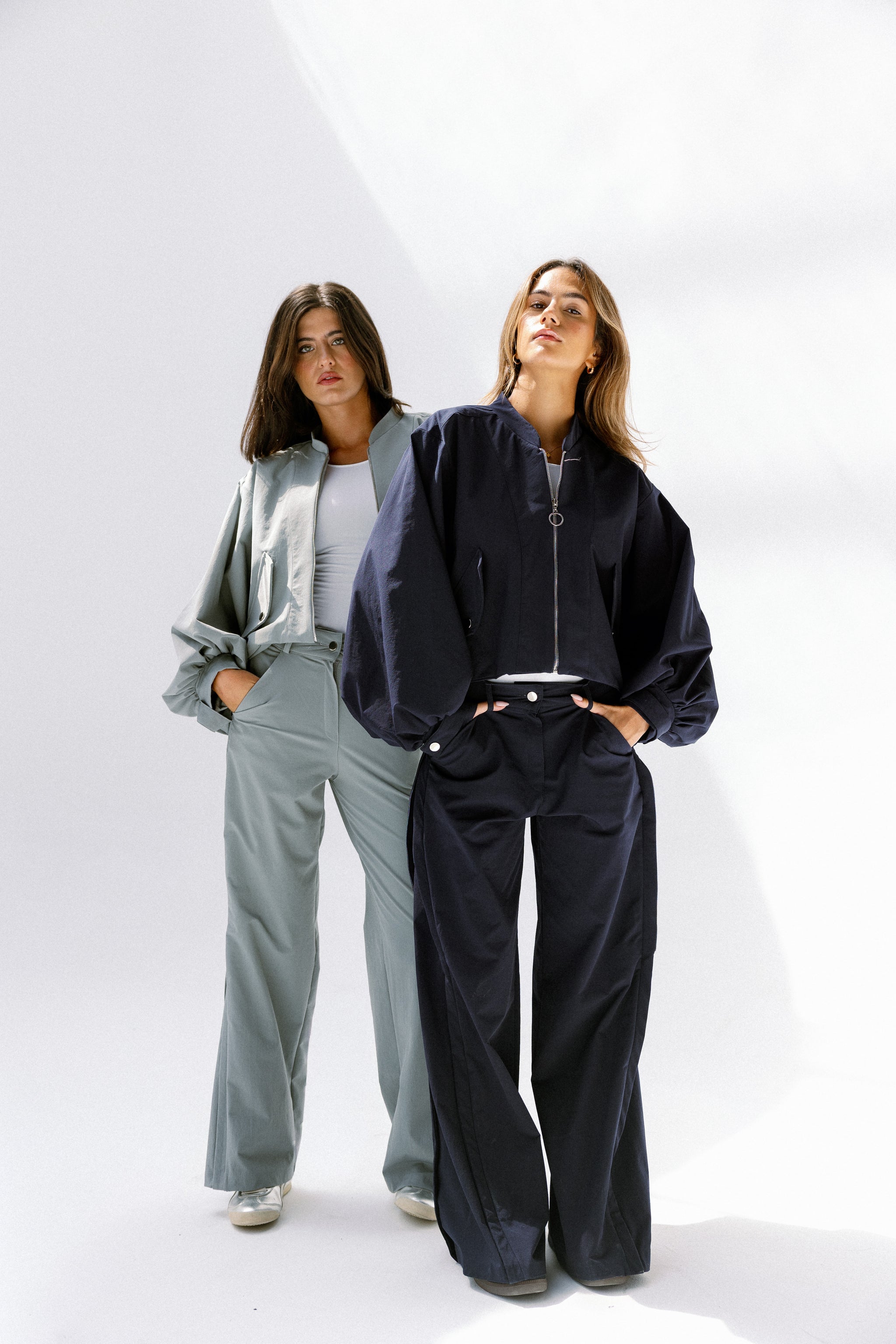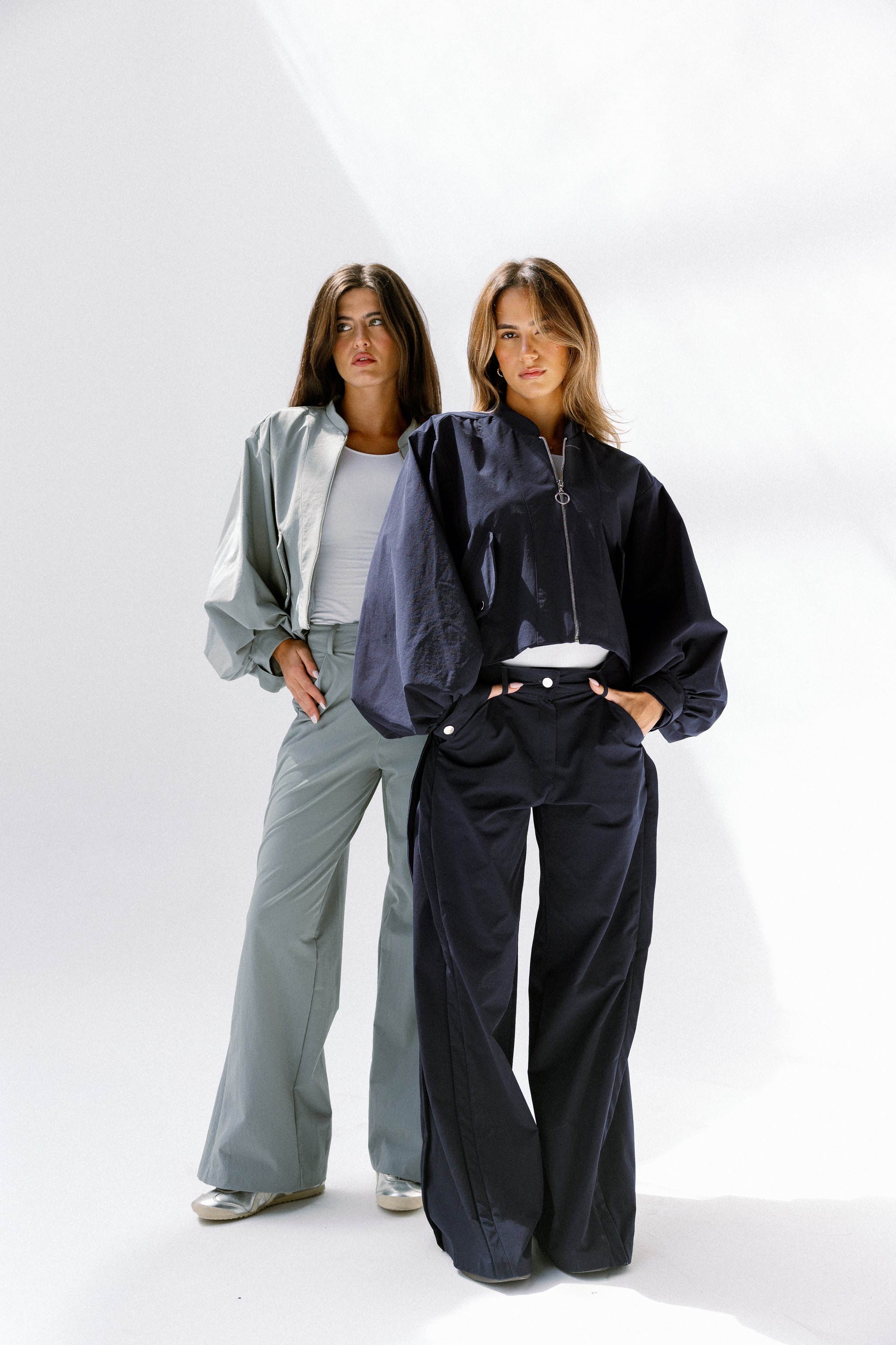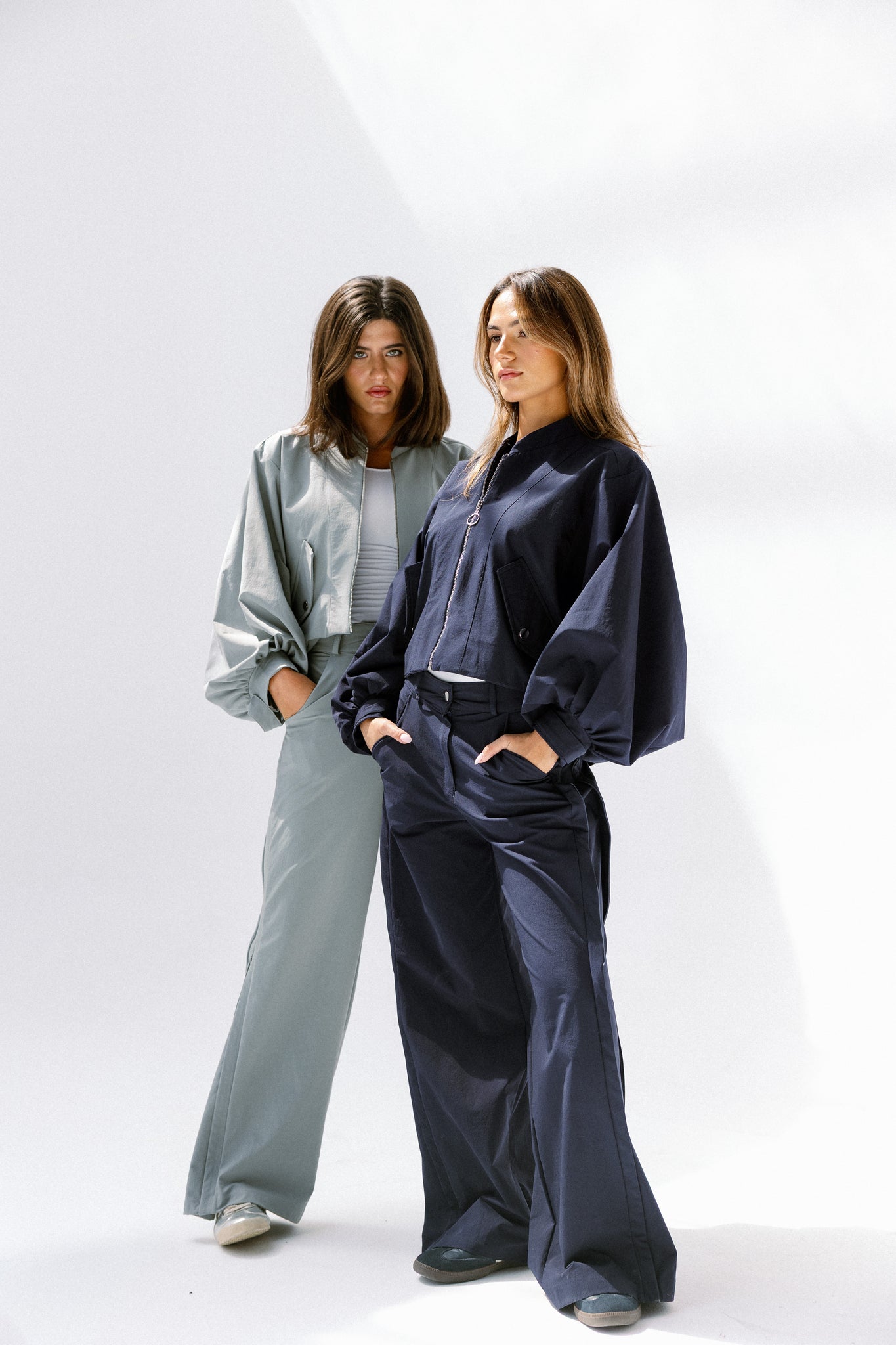 A cropped bomber jacket with exaggerated balloon sleeves and structured cuffs — creating a bold yet fluid silhouette. Individually striking, but effortlessly powerful when paired with the storm core pants.