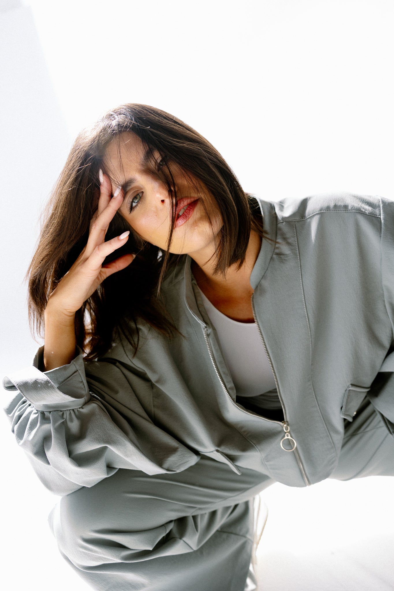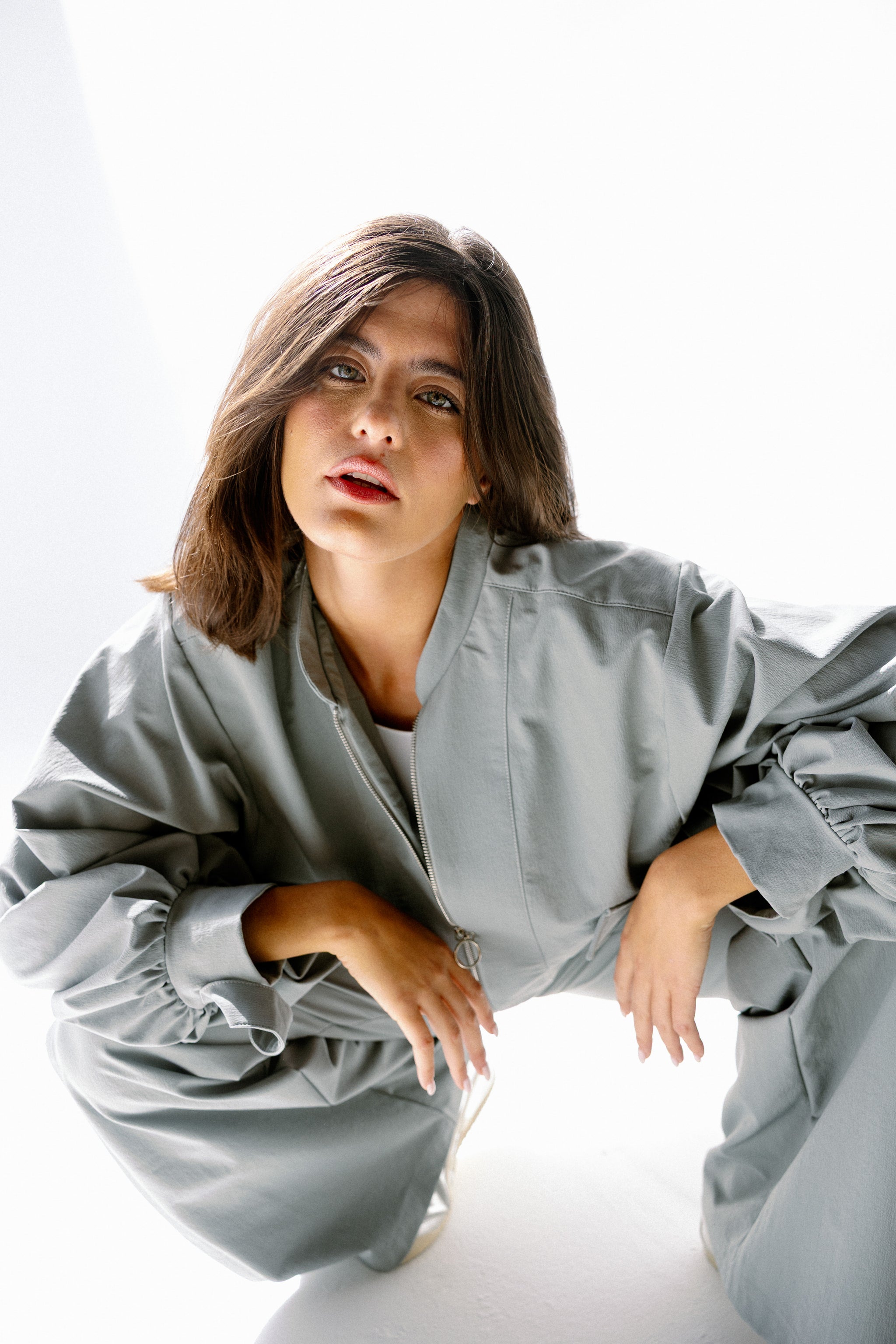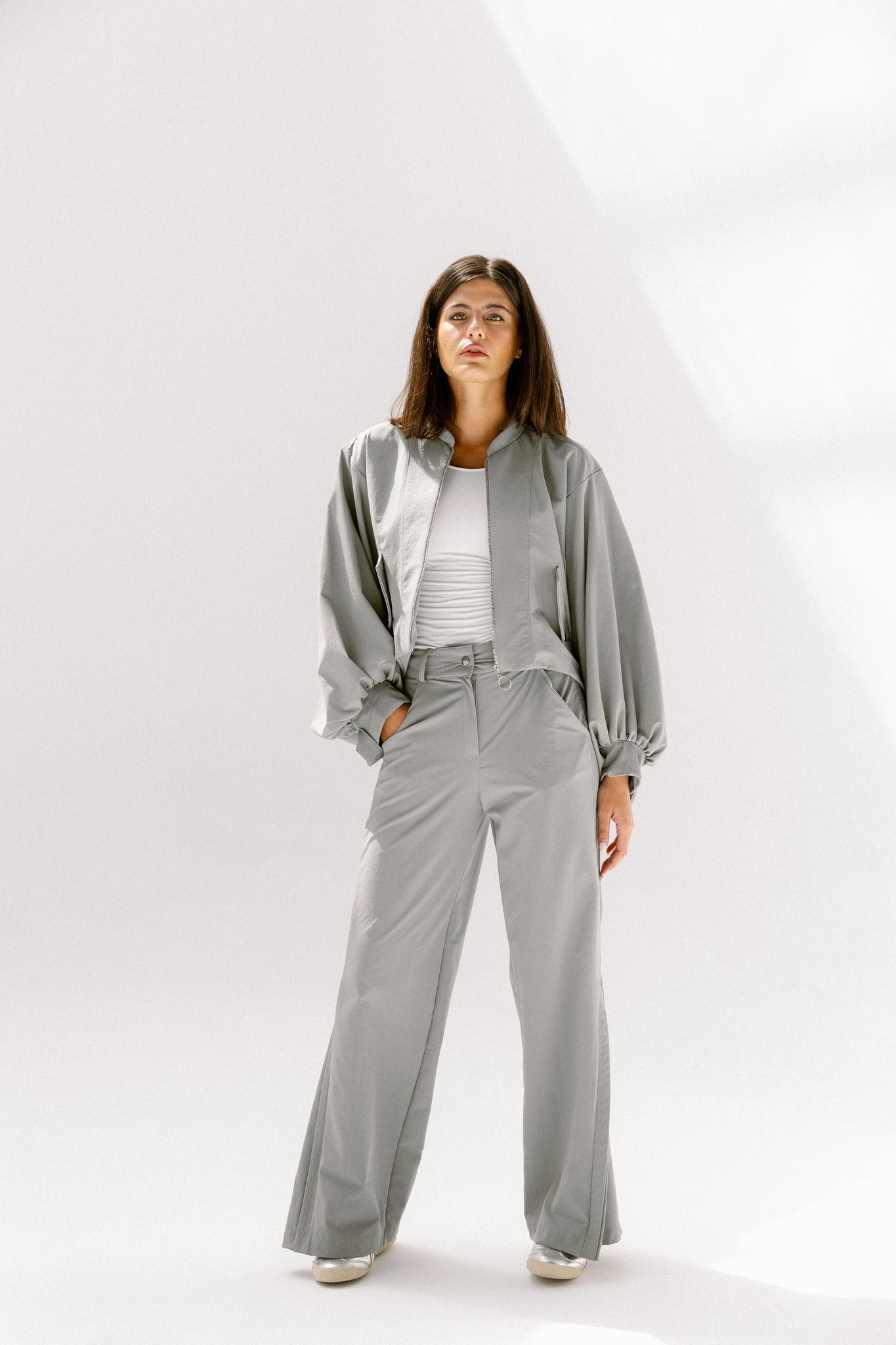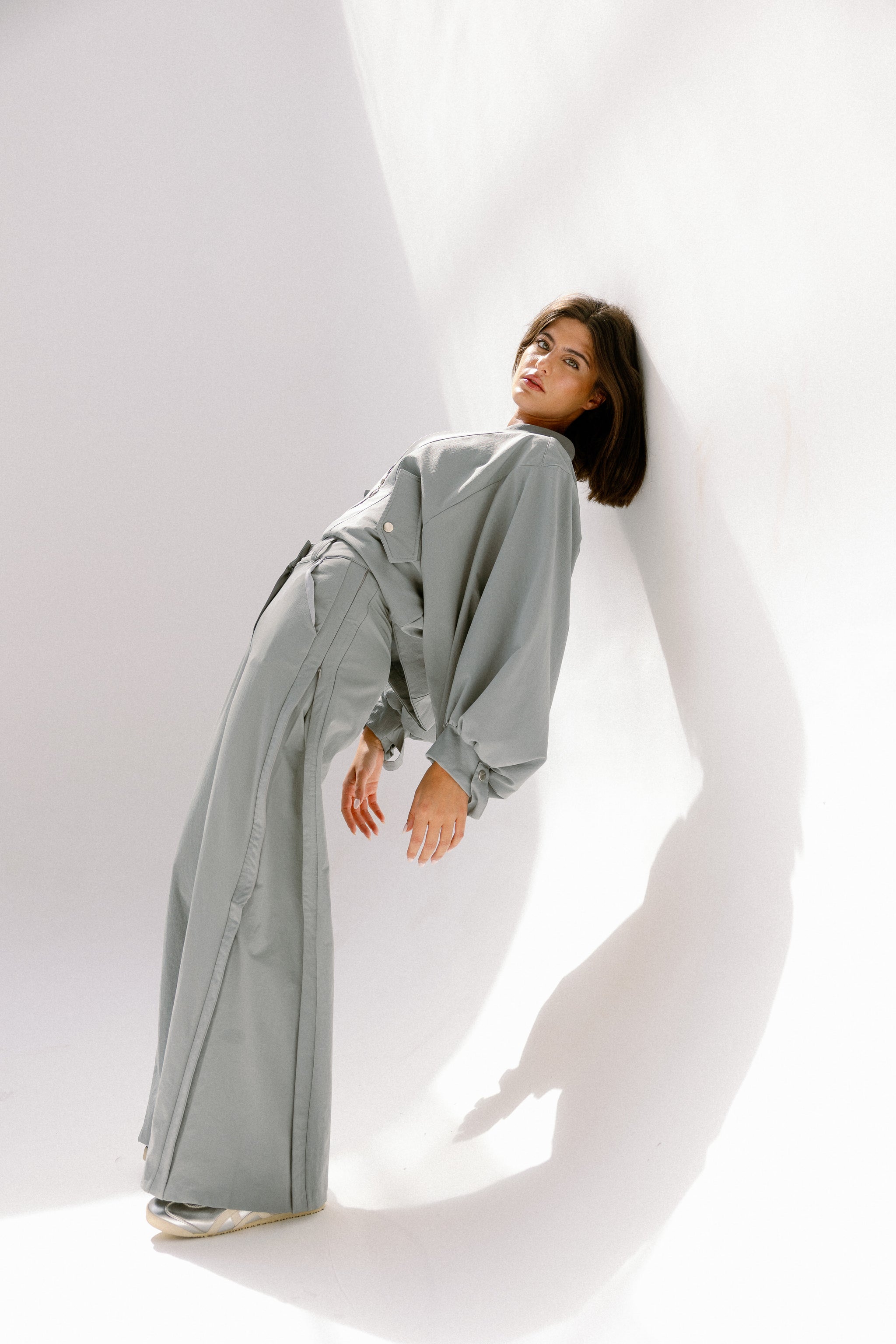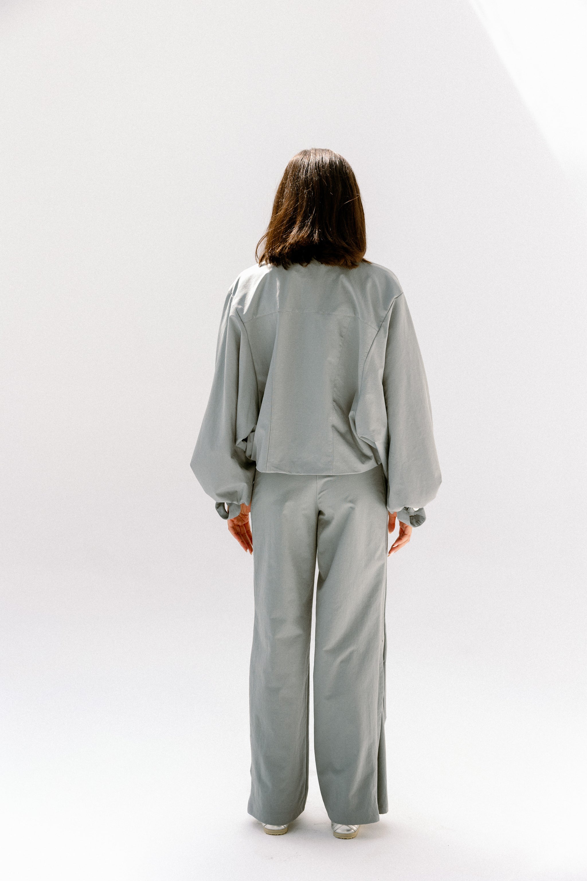 A cropped bomber jacket with exaggerated balloon sleeves and structured cuffs — creating a bold yet fluid silhouette. Individually striking, but effortlessly powerful when paired with the storm core pants.