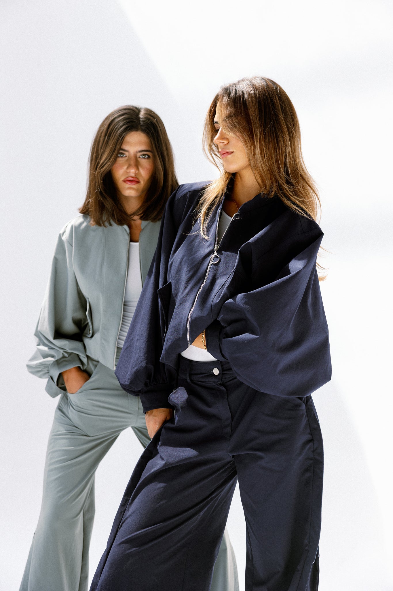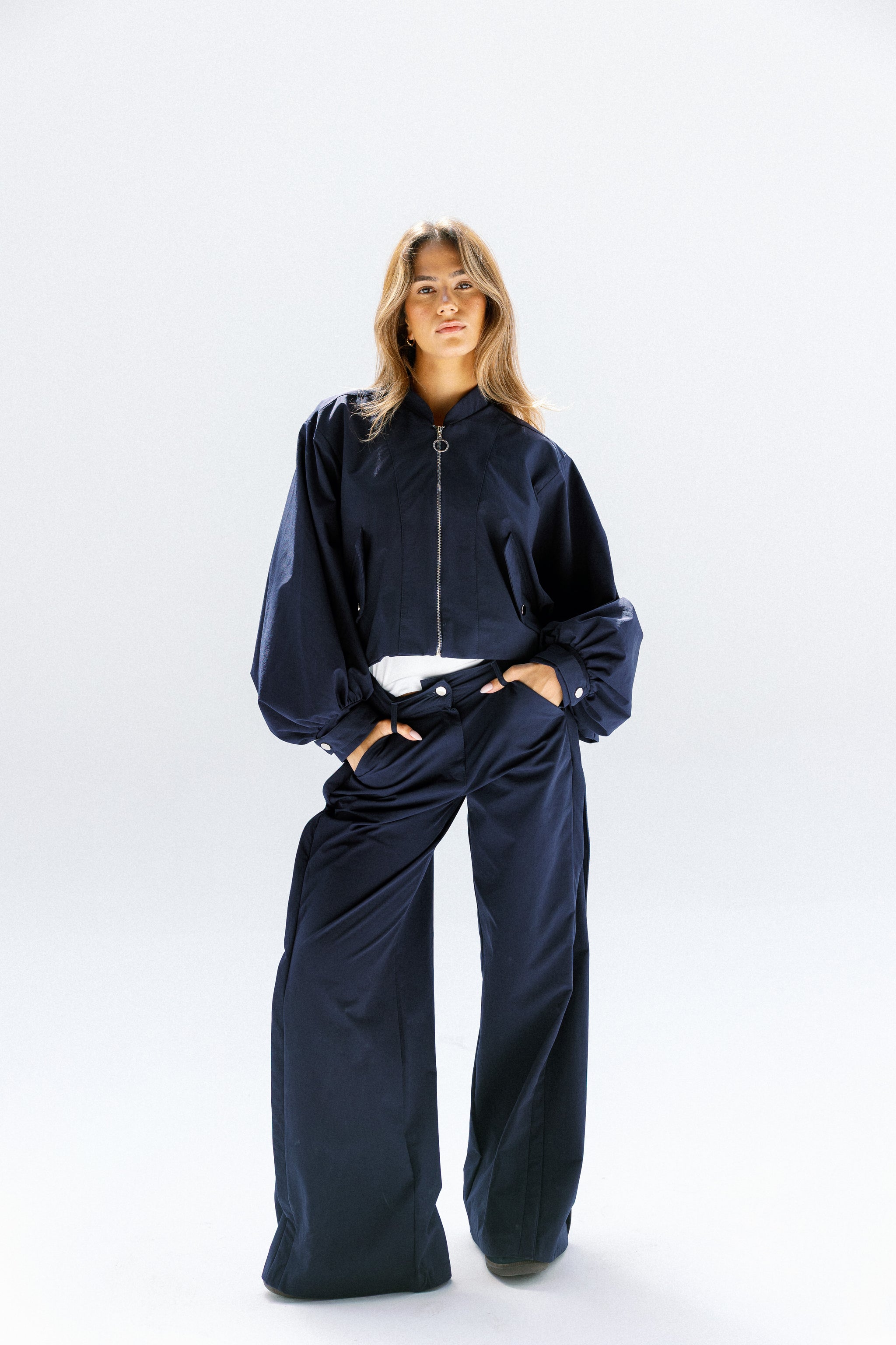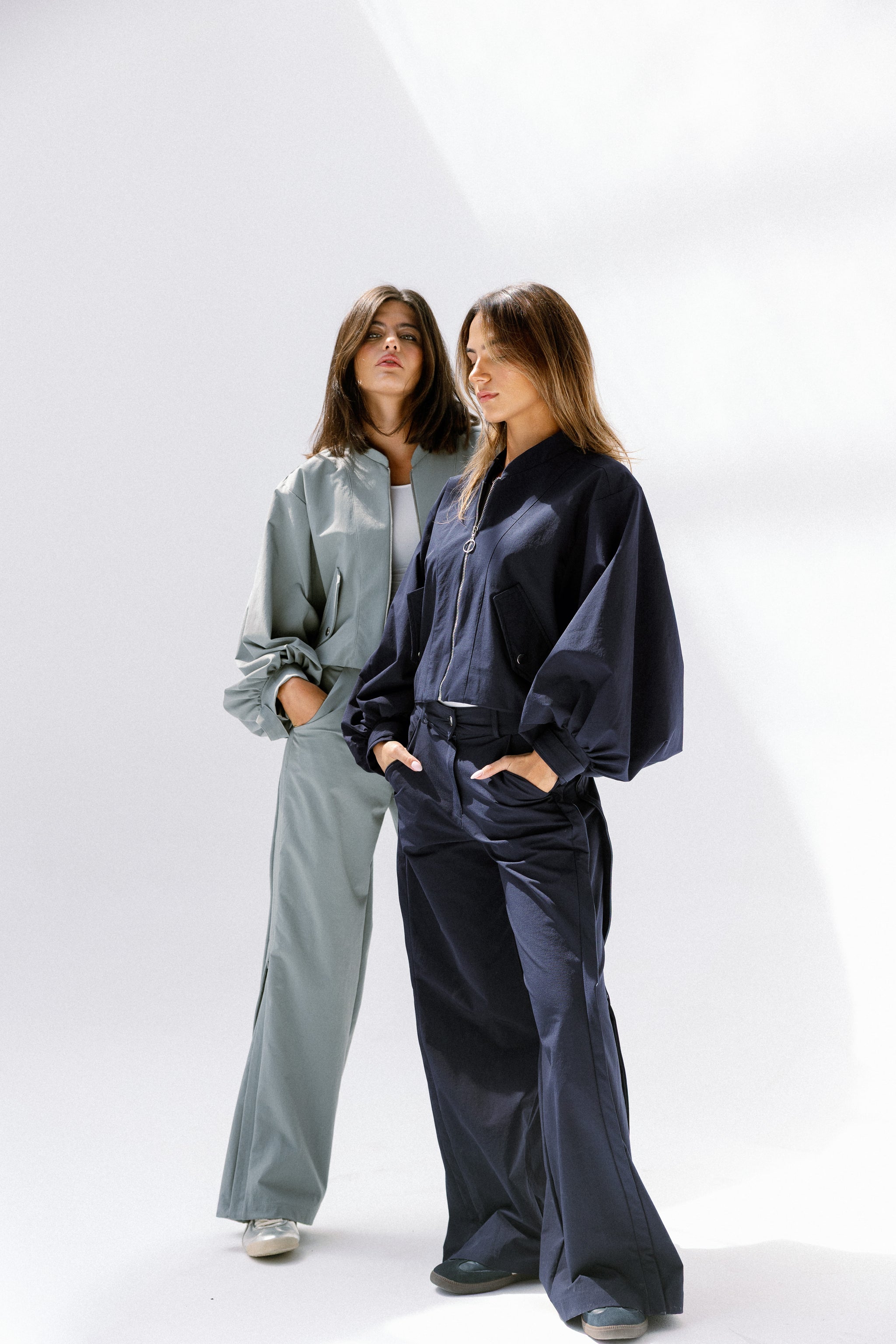 A cropped bomber jacket with exaggerated balloon sleeves and structured cuffs — creating a bold yet fluid silhouette. Individually striking, but effortlessly powerful when paired with the storm core pants.