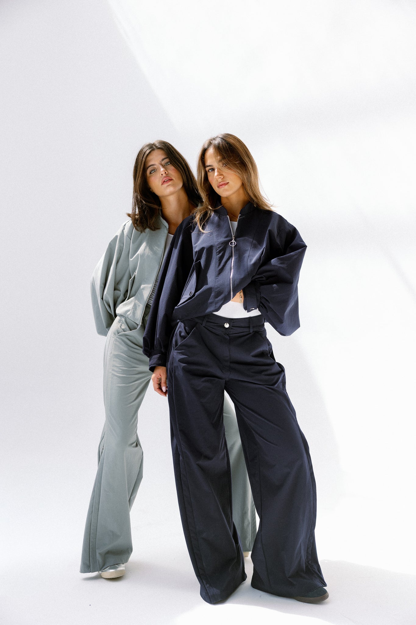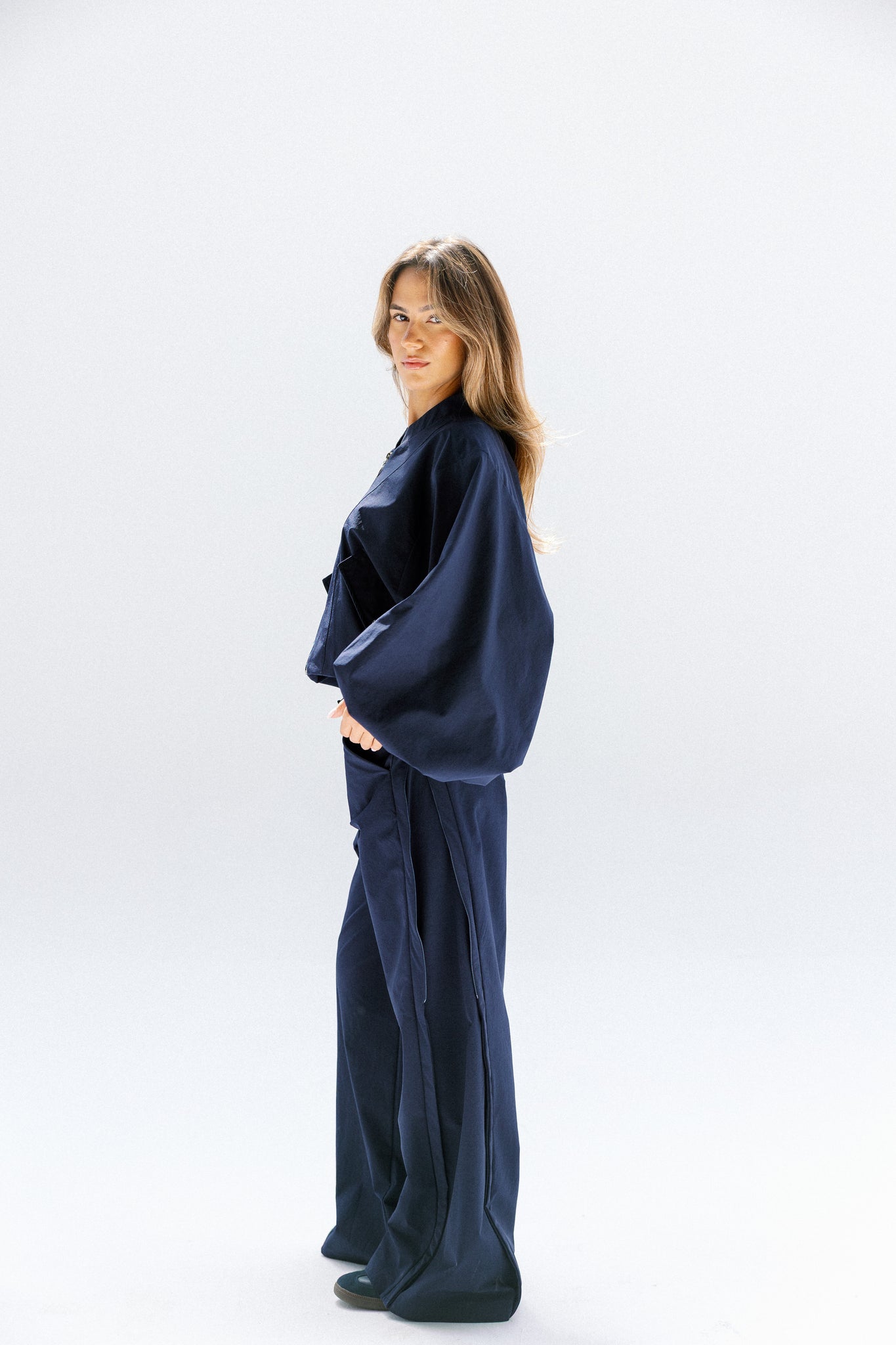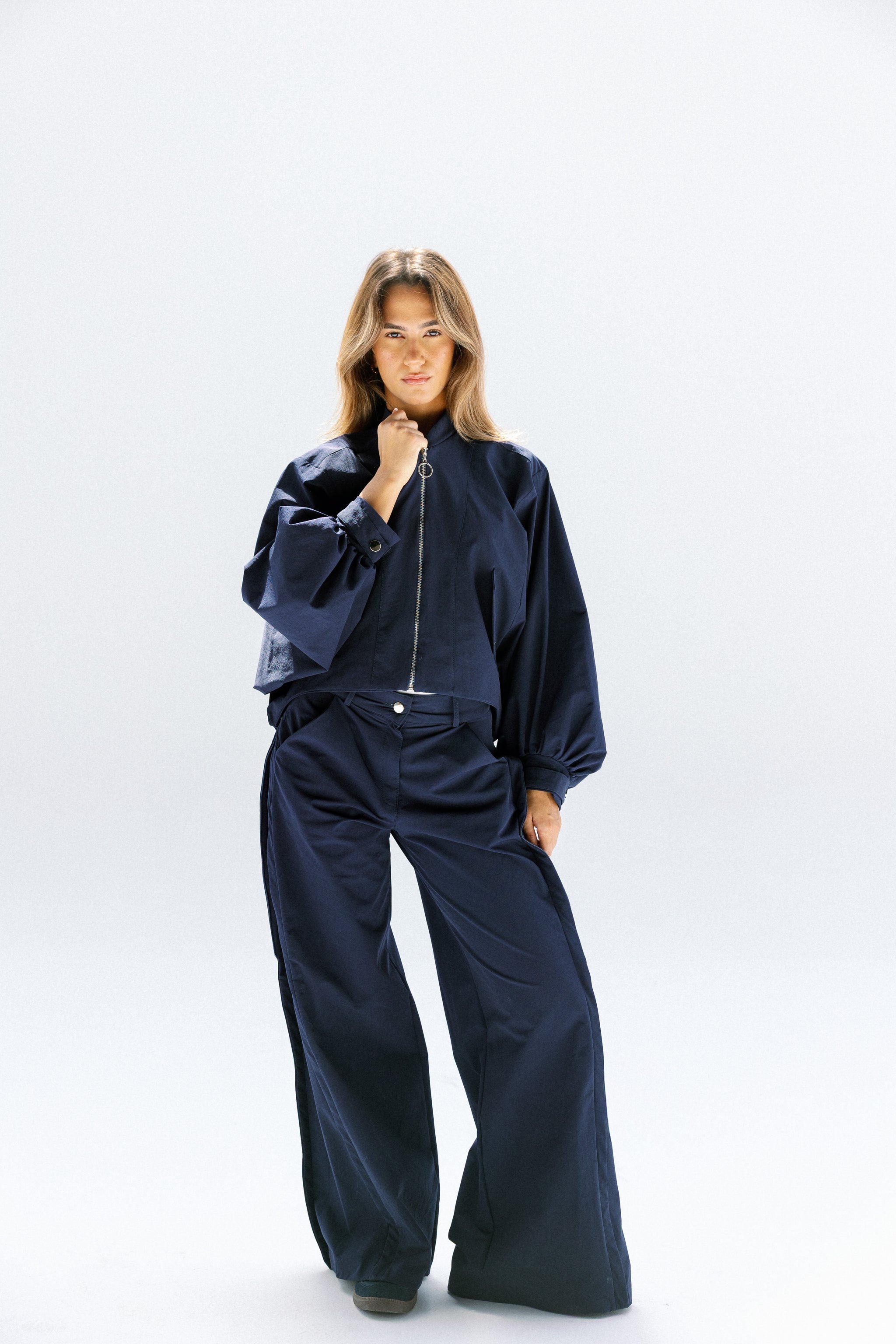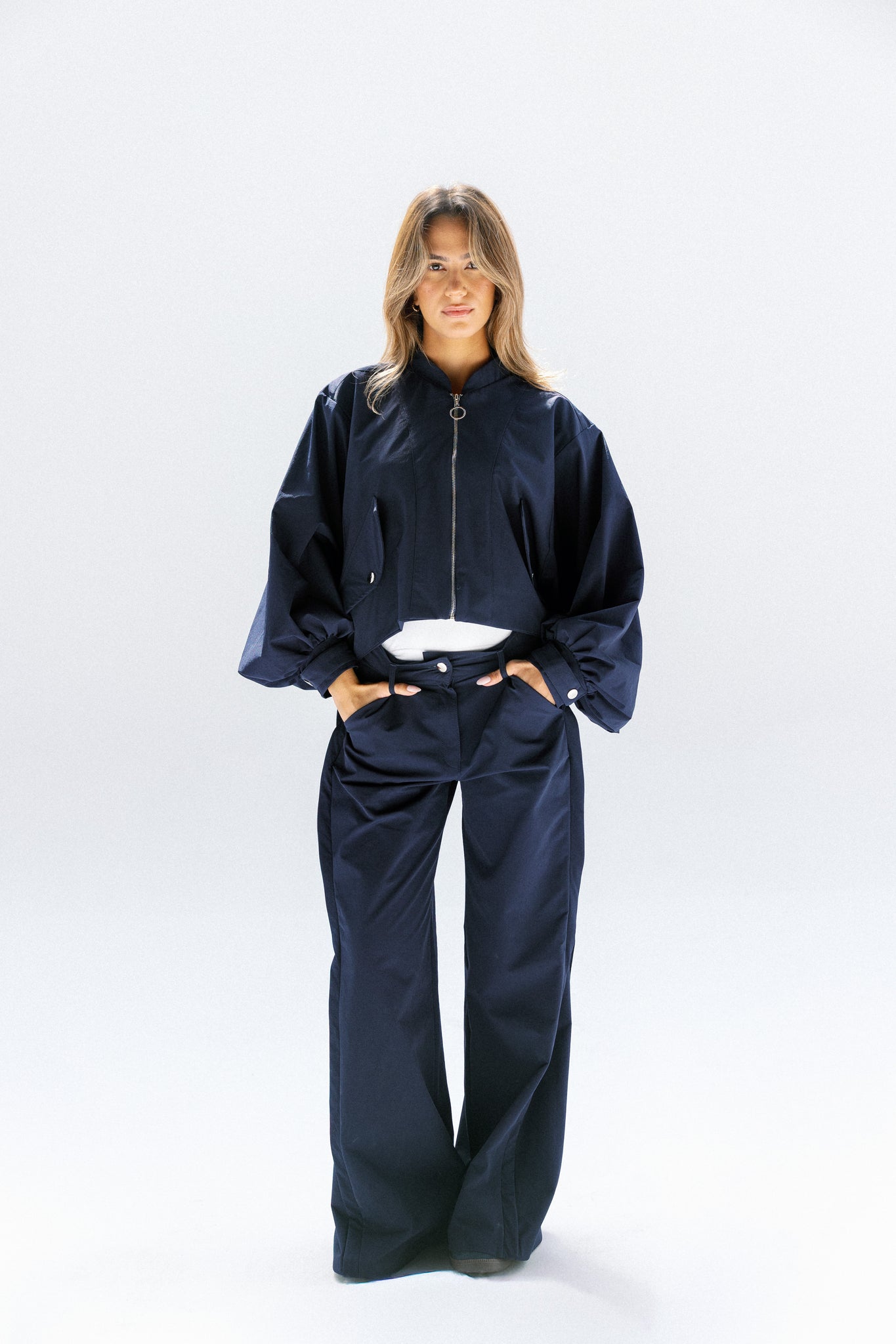 A cropped bomber jacket with exaggerated balloon sleeves and structured cuffs — creating a bold yet fluid silhouette. Individually striking, but effortlessly powerful when paired with the storm core pants.