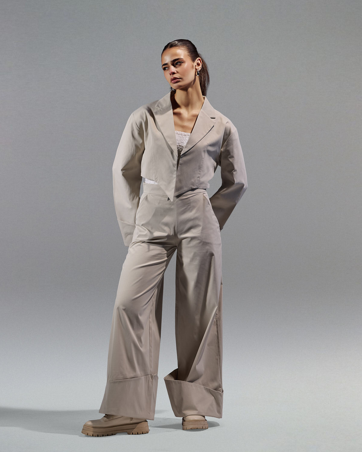 Color:Cream,Fabric:gabardine Details:Oversized sleeves with folded endsNotched lapel collarStructured shouldersExtended wide cuffsCorset-style back for a cinched"