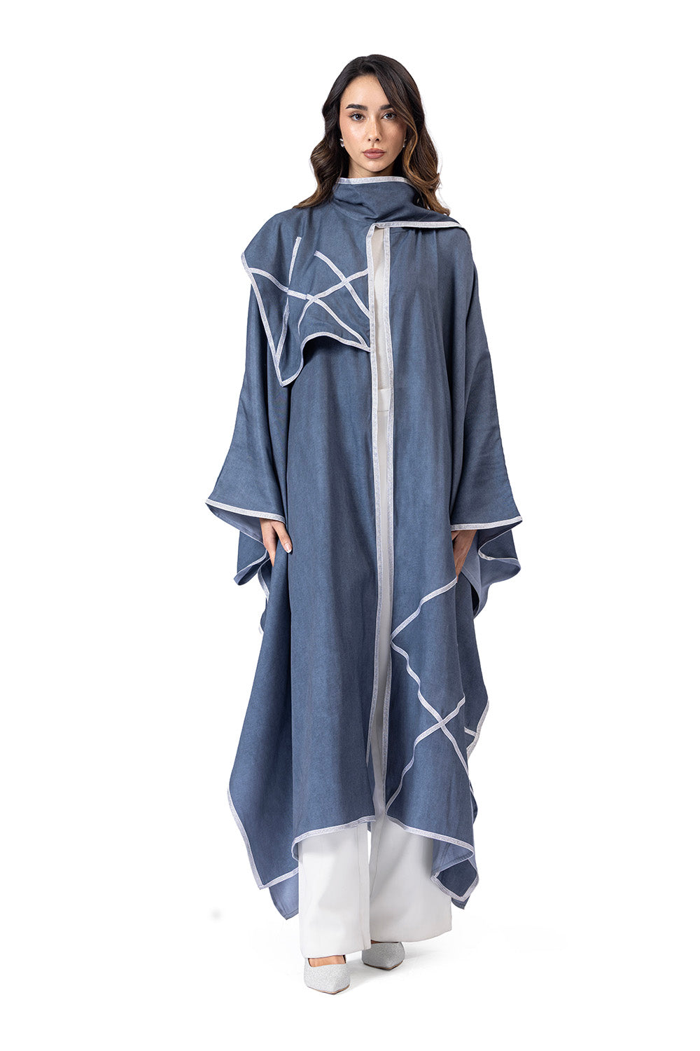 The Asala kaftan is accented with bold, contrasting white piping that forms abstract geometric lines across the body, adding a sense of movement and structure. Made from jeans tansell.