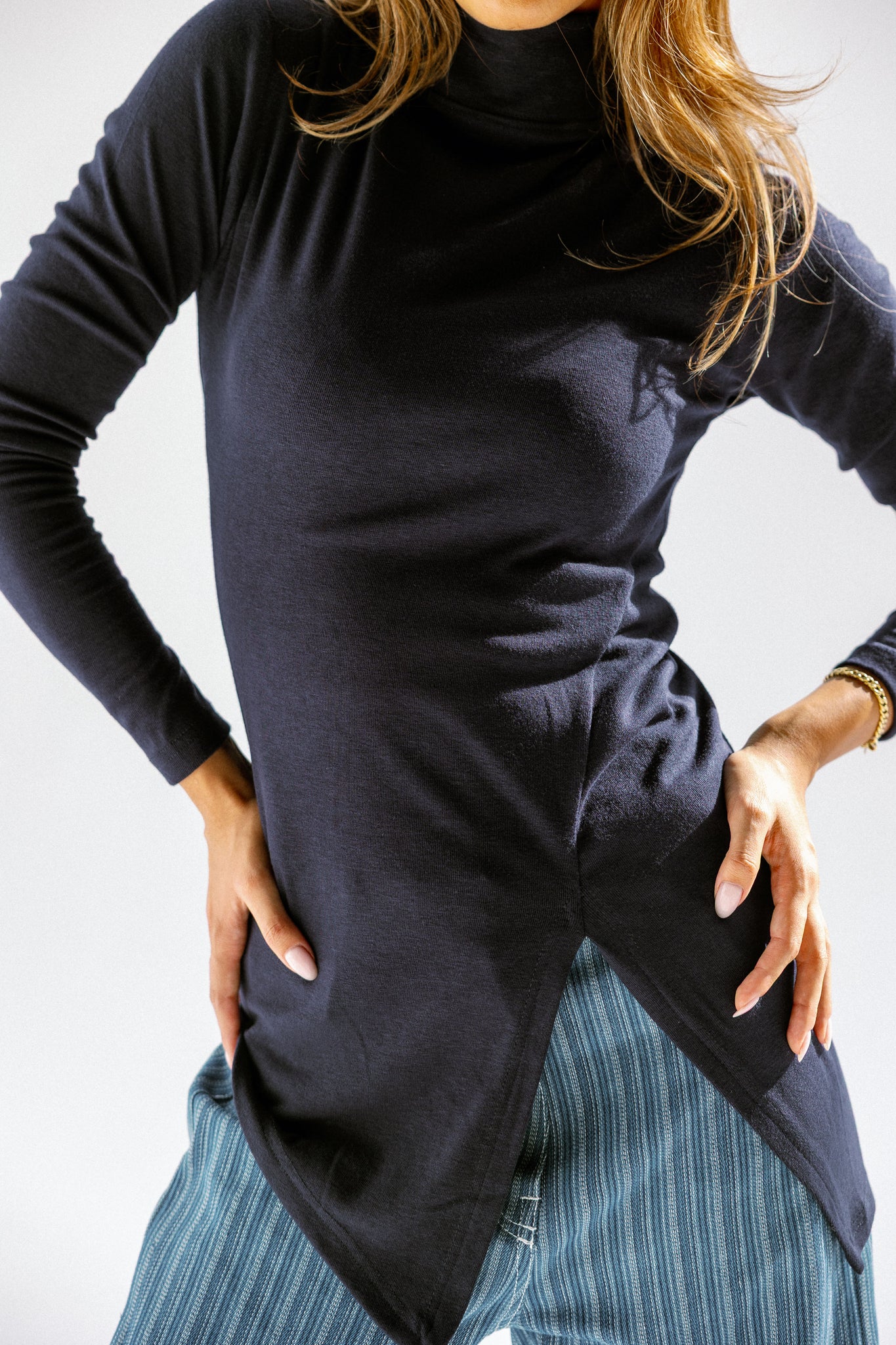 Features a high collar with a V-shaped front opening and delicate baby buttons for a refined, modern finish.