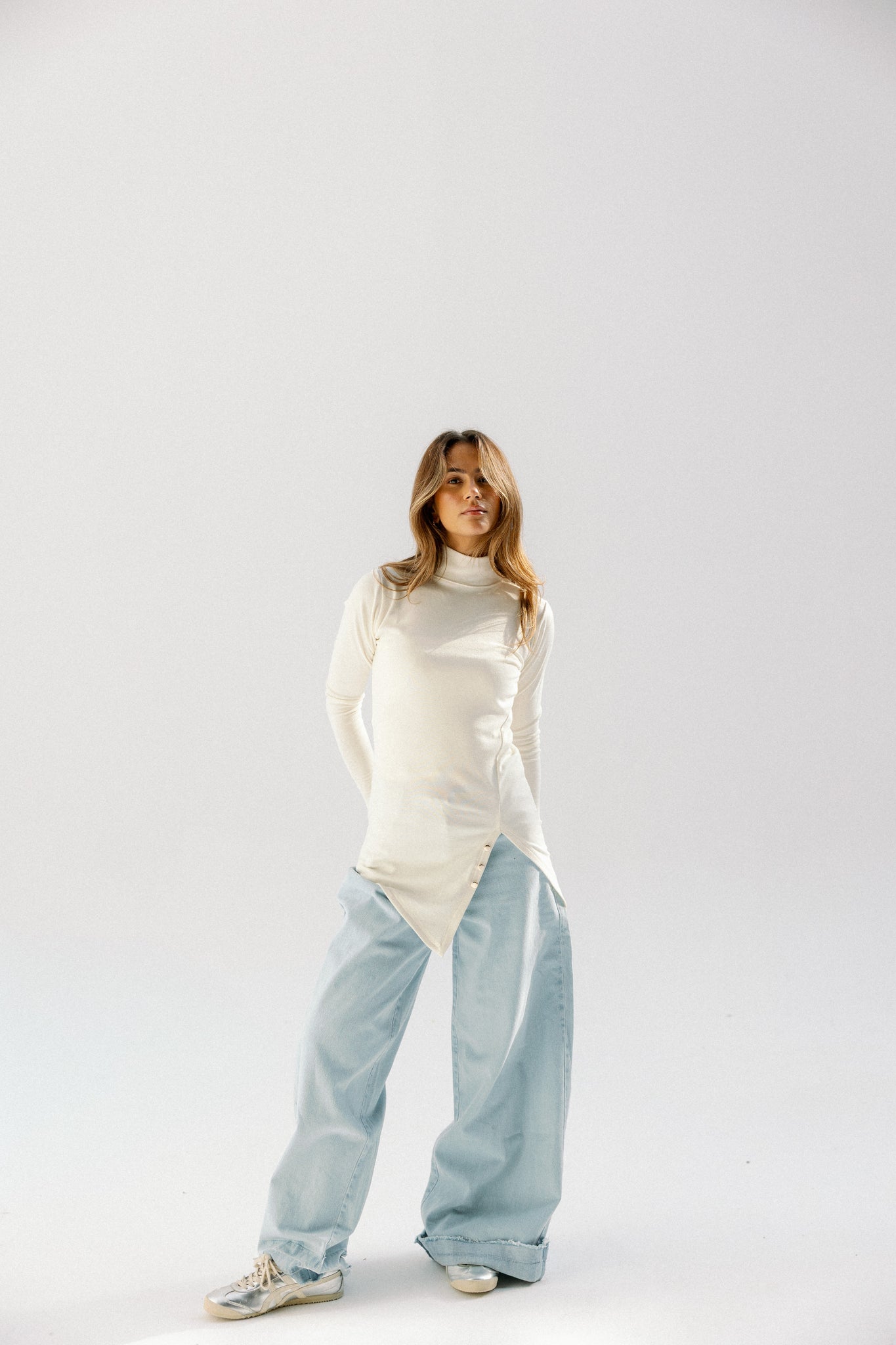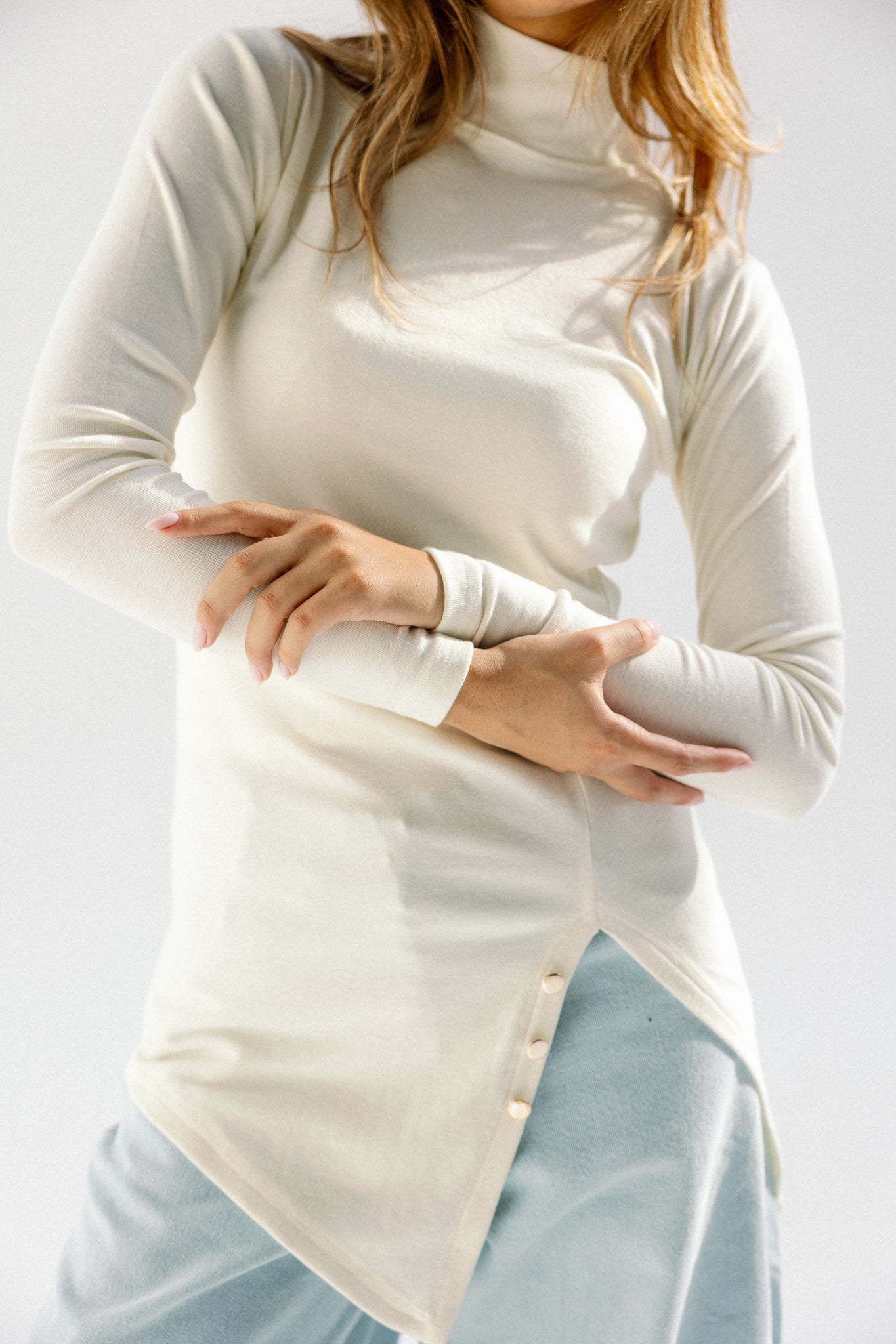 Features a high collar with a V-shaped front opening and delicate baby buttons for a refined, modern finish.