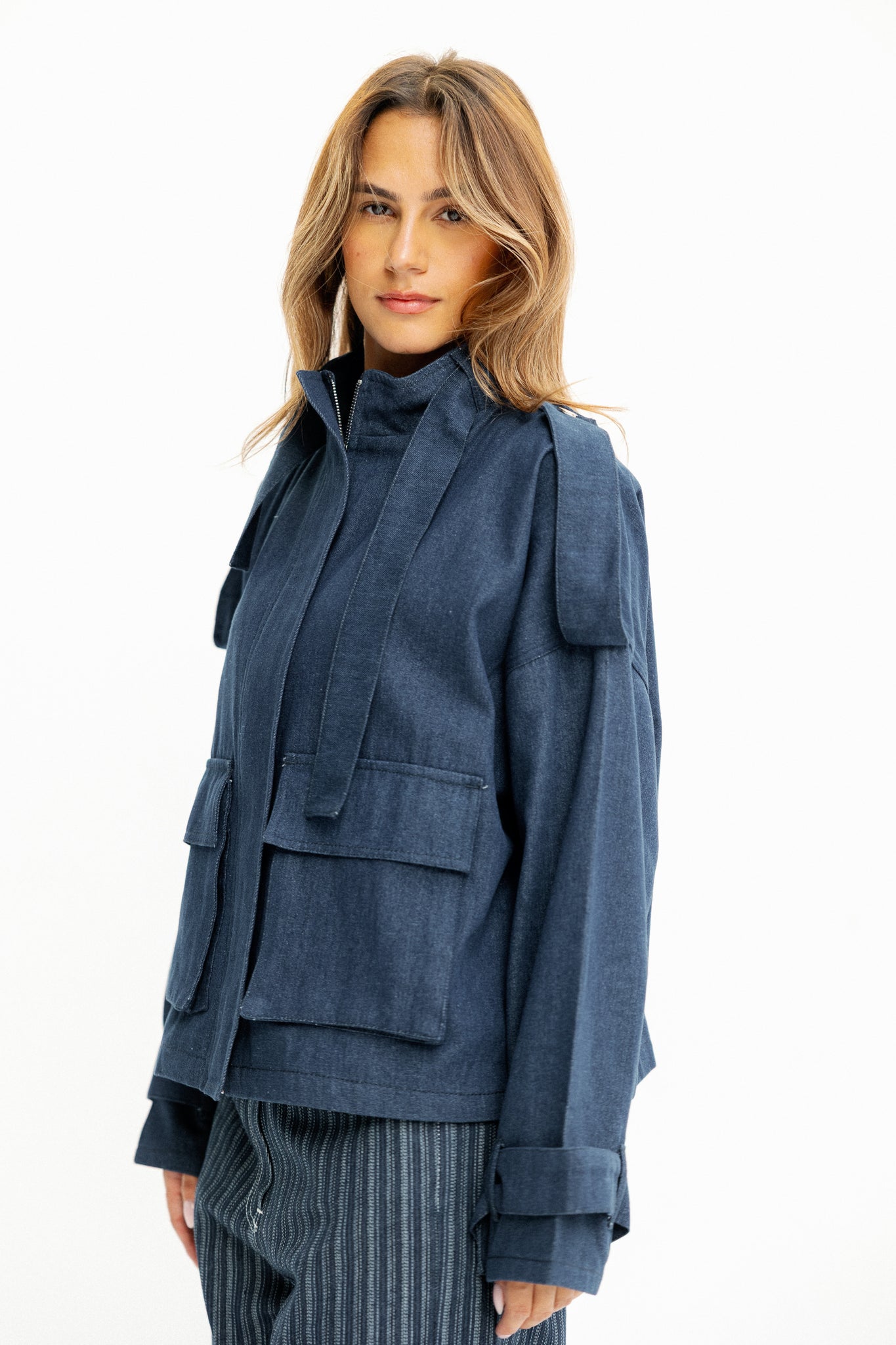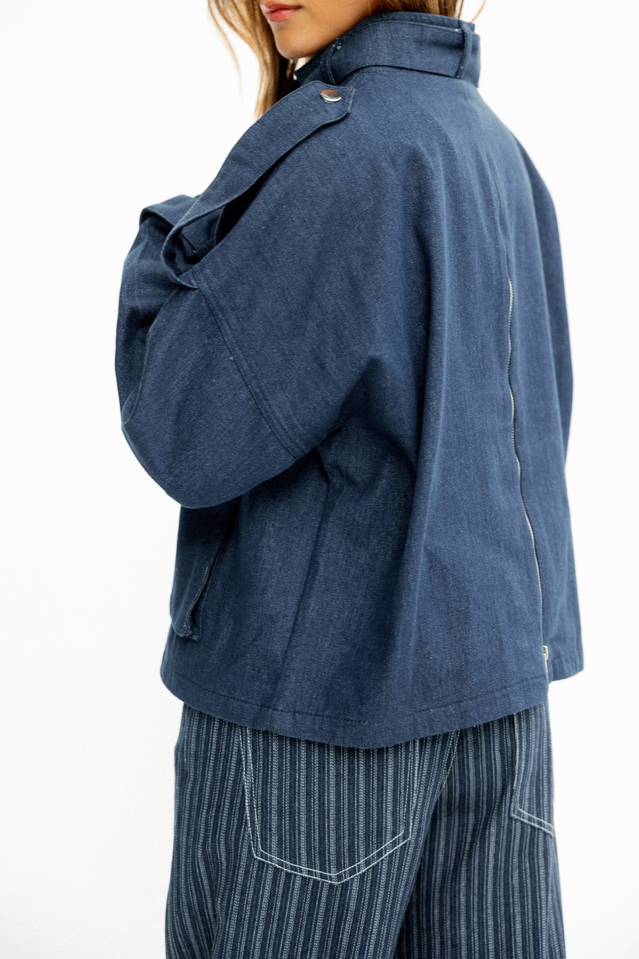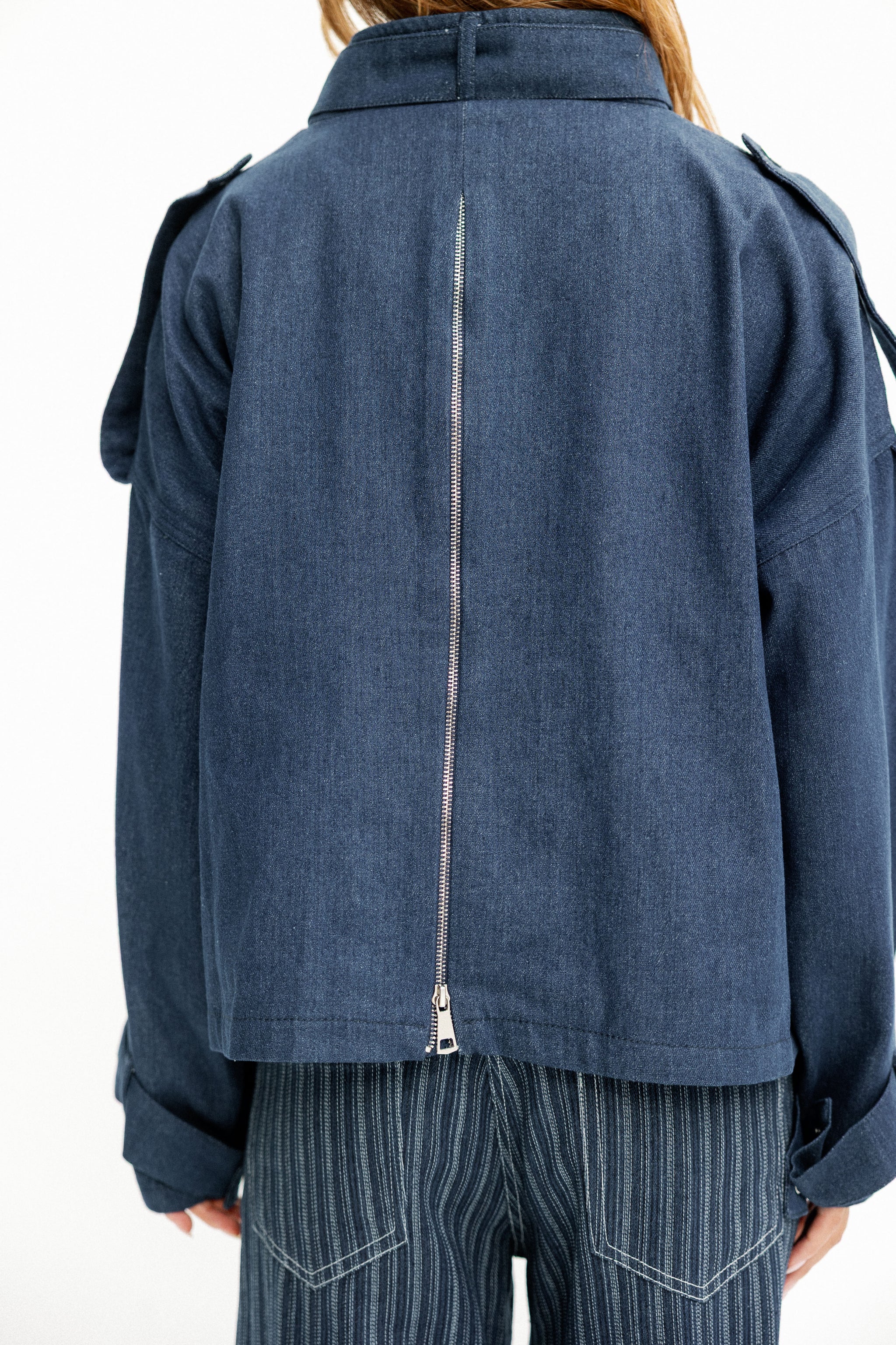 Back-Zip Denim Utility Jacket A fashion-forward denim outfit featuring a loose-fitting dark blue denim jacket with a prominent vertical zipper running down the back. The jacket has wide sleeves, buttoned shoulder tabs, and is paired with matching denim pants. The model is photographed from behind against a blue checkered fabric backdrop, with wet-styled hair adding a modern, edgy look