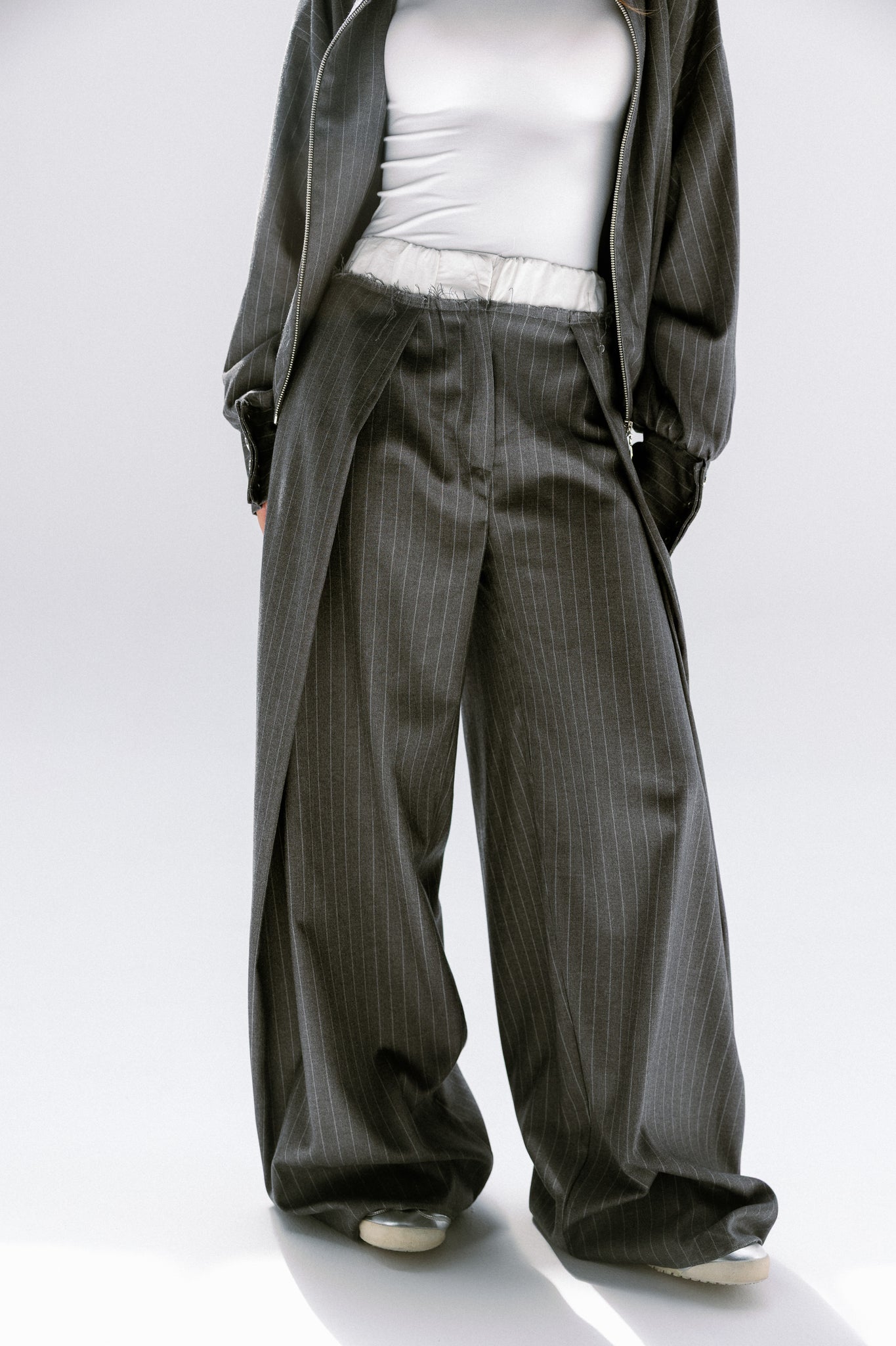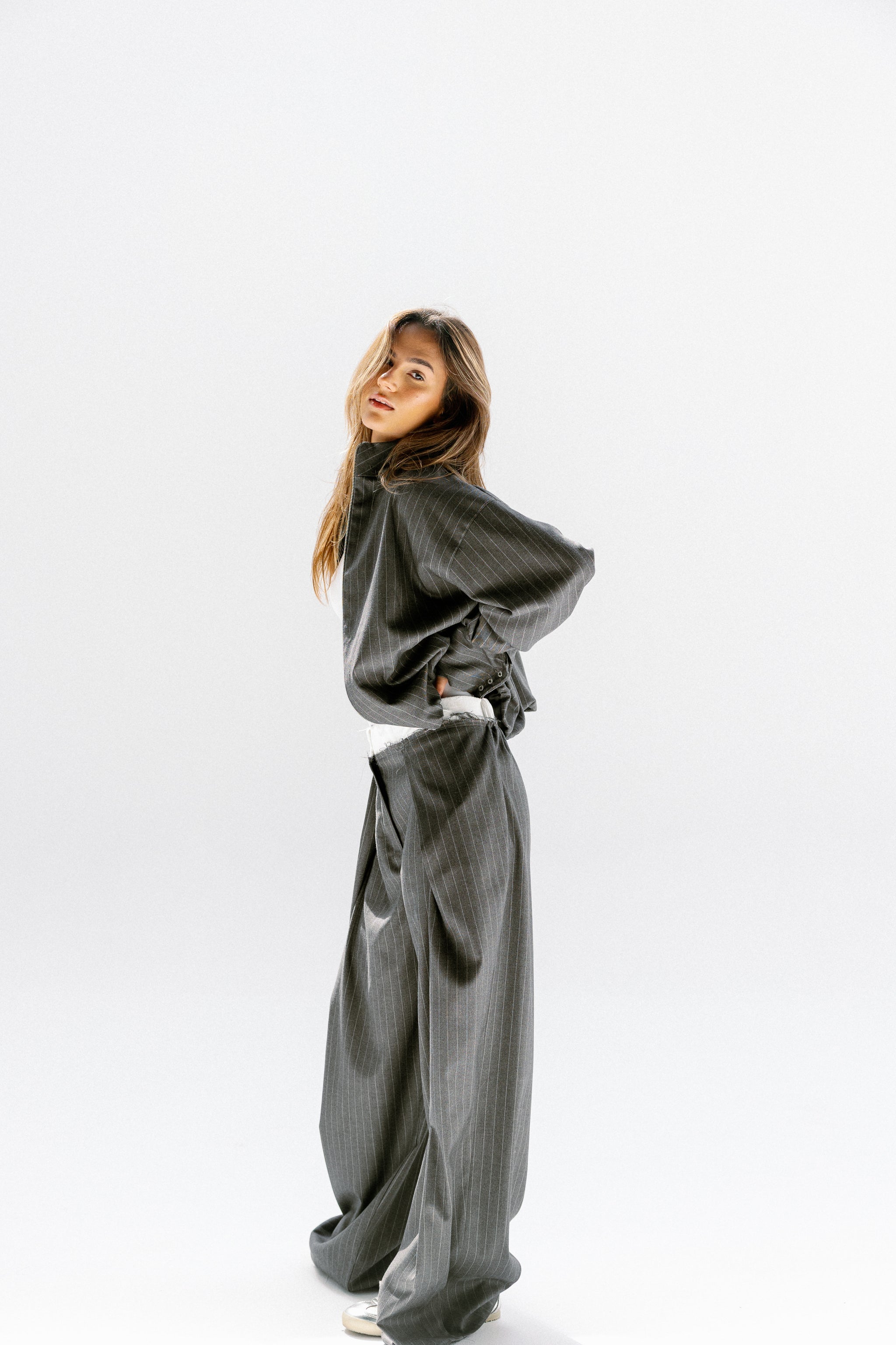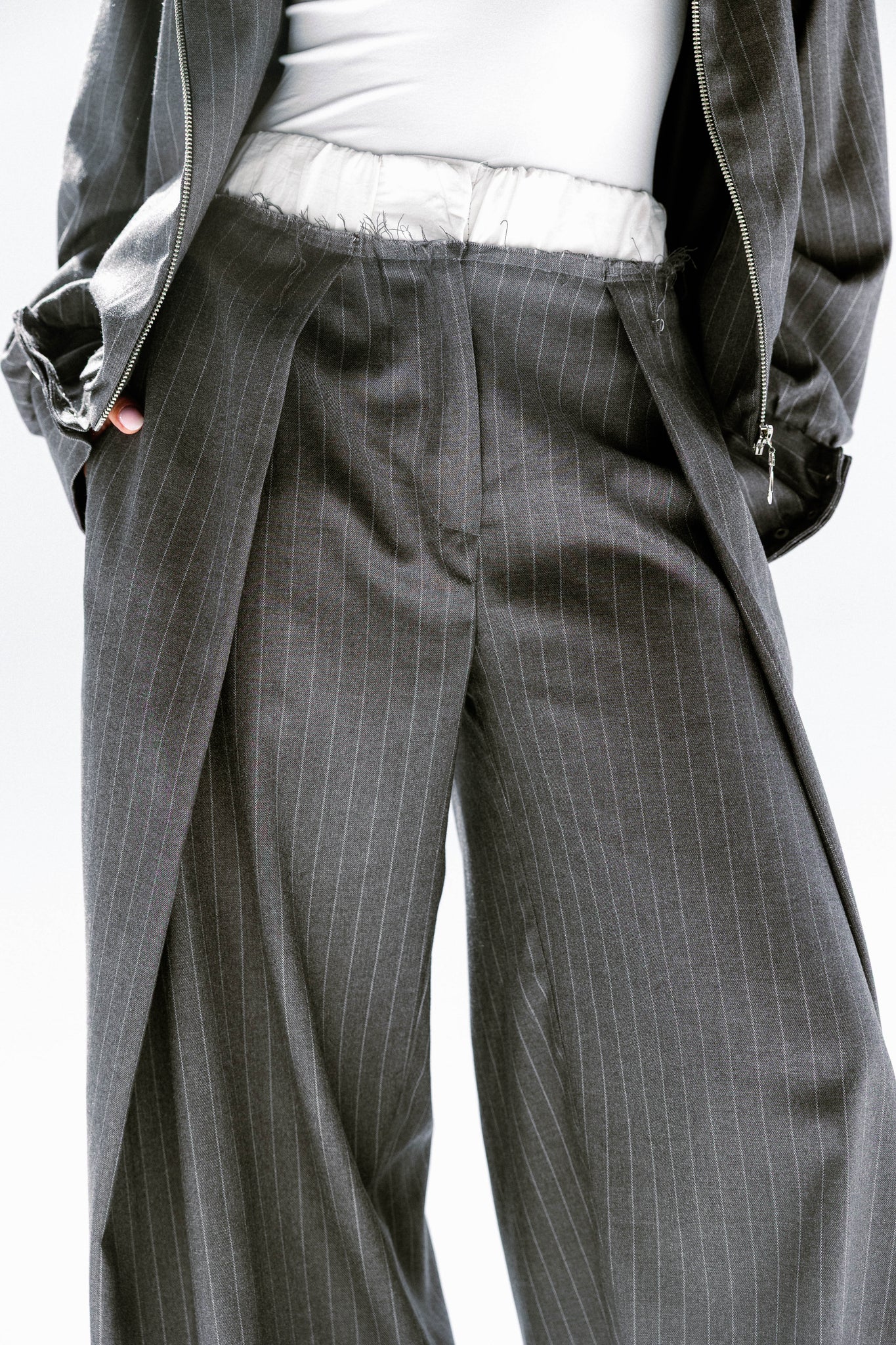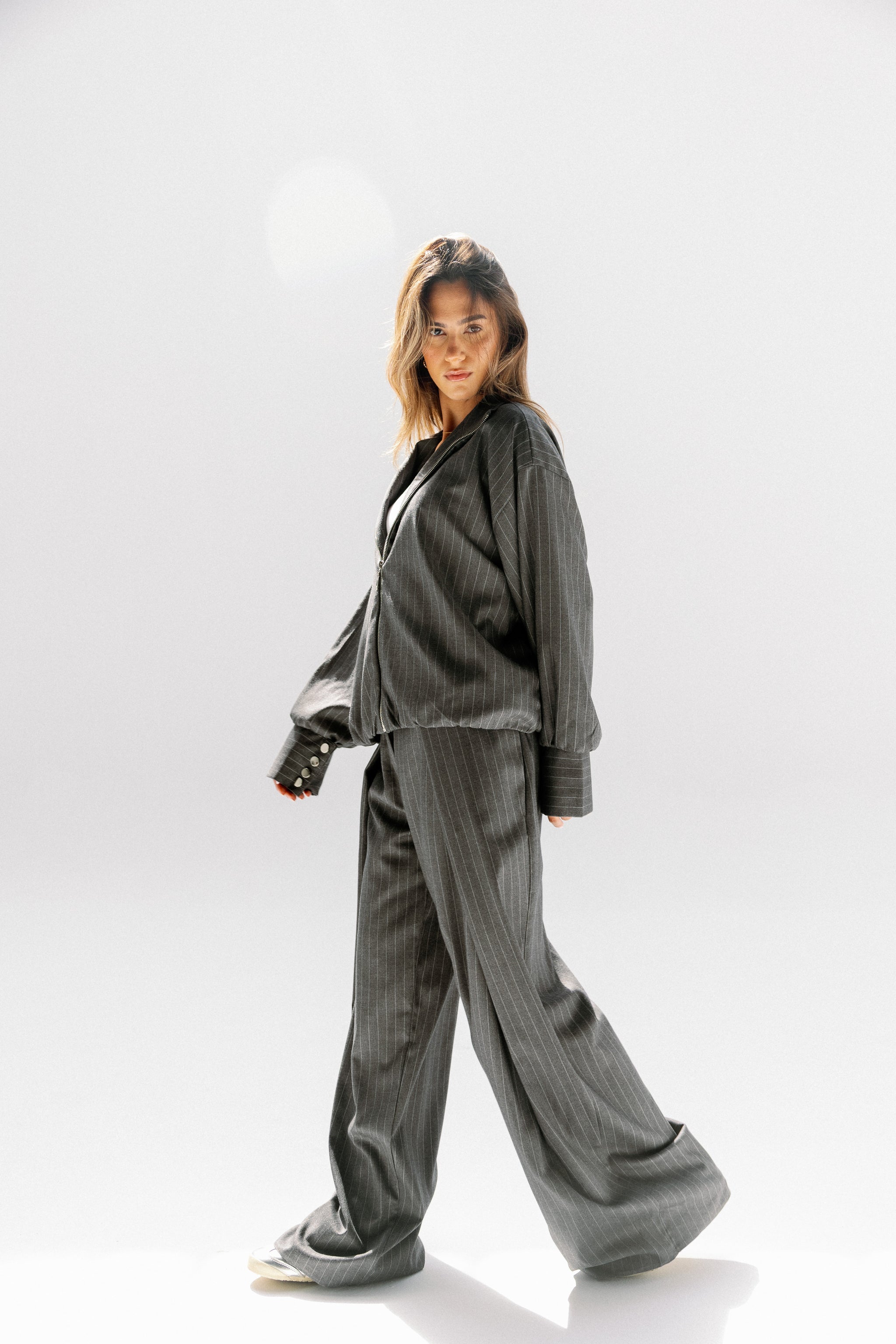 wide-leg trousers, designed in subtle pinstripes that nod to classic suiting with a modern, laid-back twist and a relaxed drape. Individually striking, but effortlessly powerful when paired with the urban ease jacket.