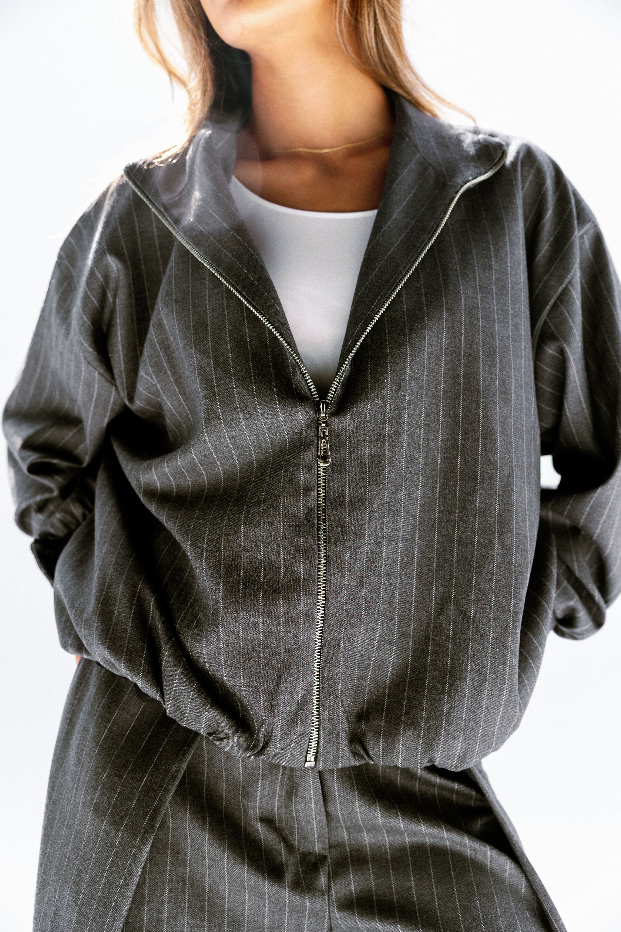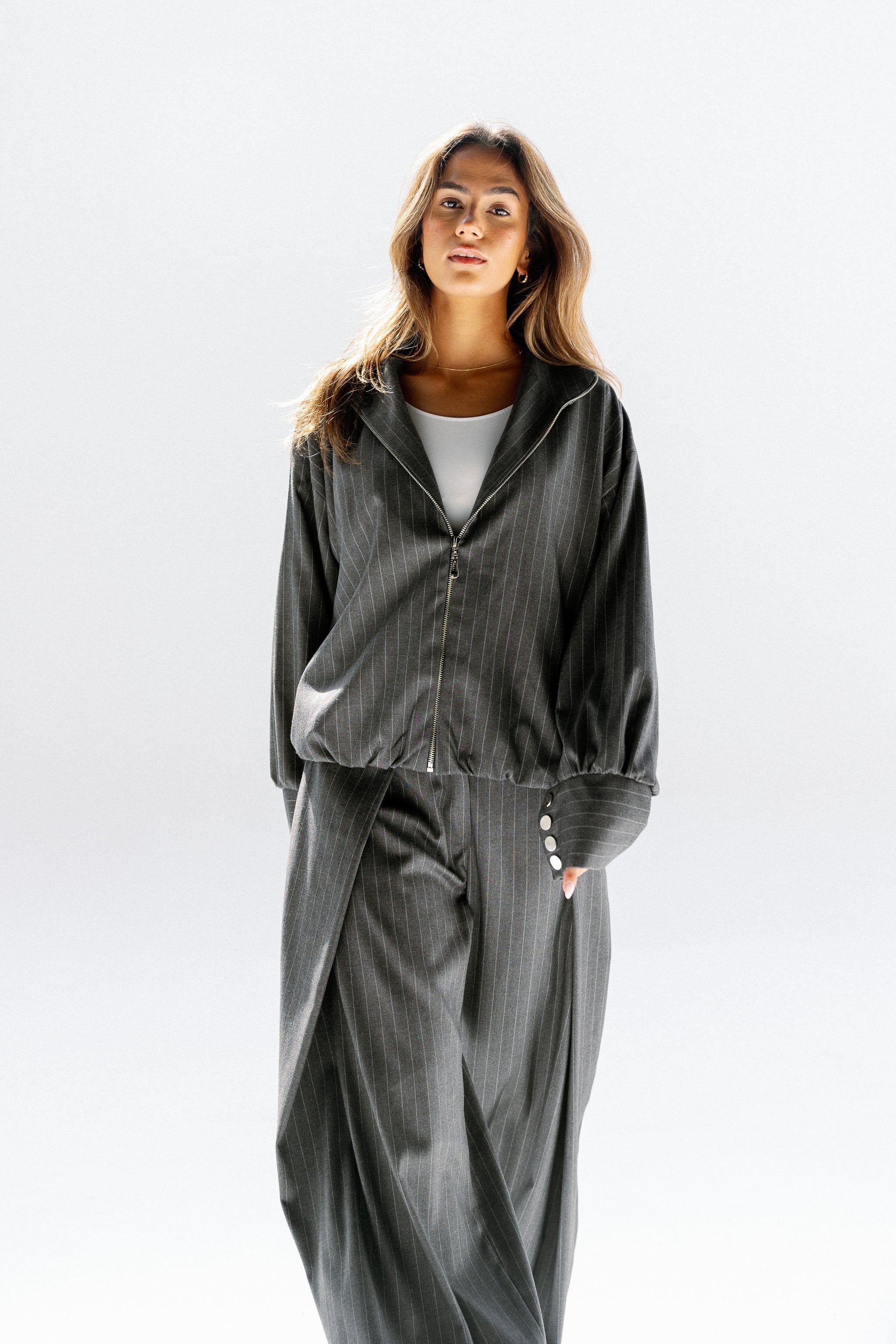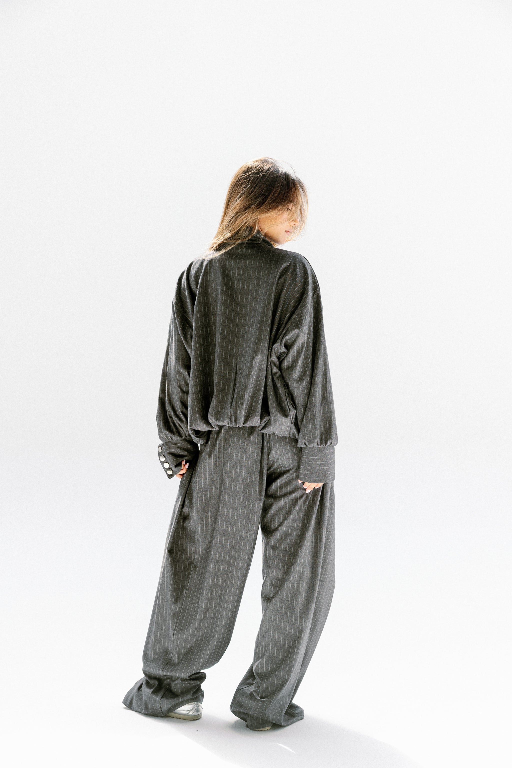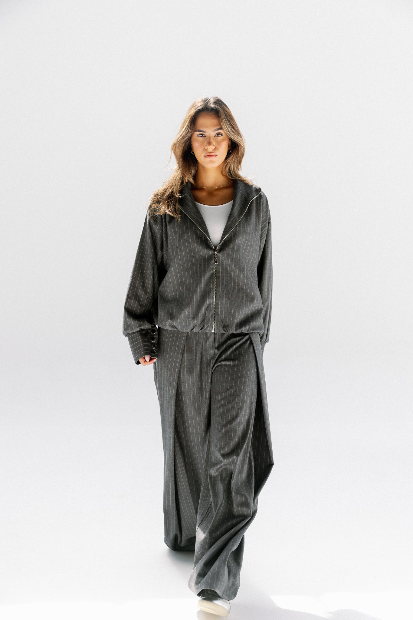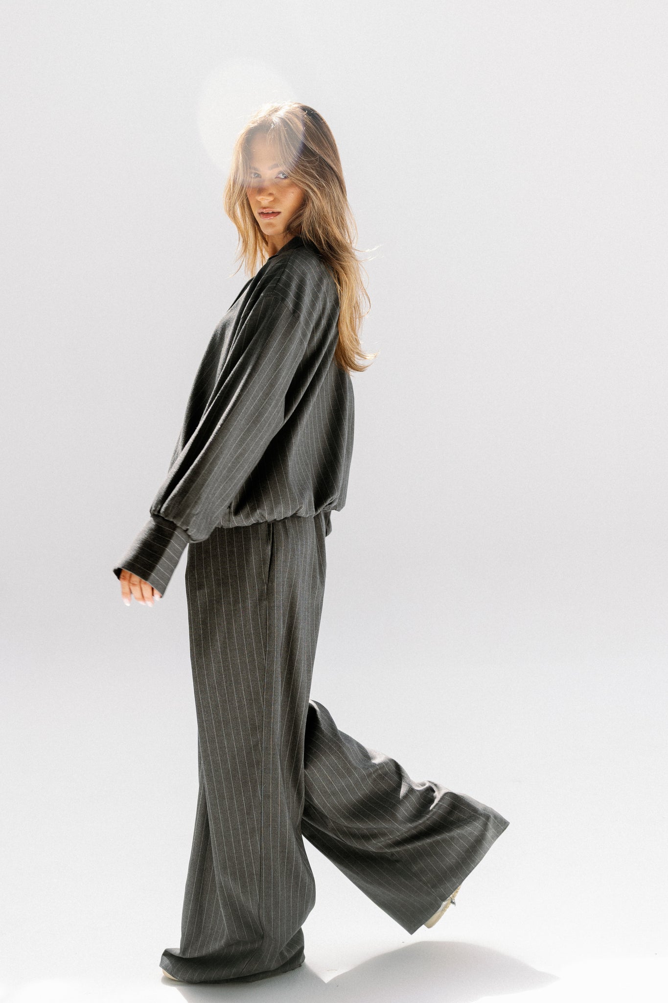 wide-leg trousers, designed in subtle pinstripes that nod to classic suiting with a modern, laid-back twist and a relaxed drape. Individually striking, but effortlessly powerful when paired with the urban ease jacket.